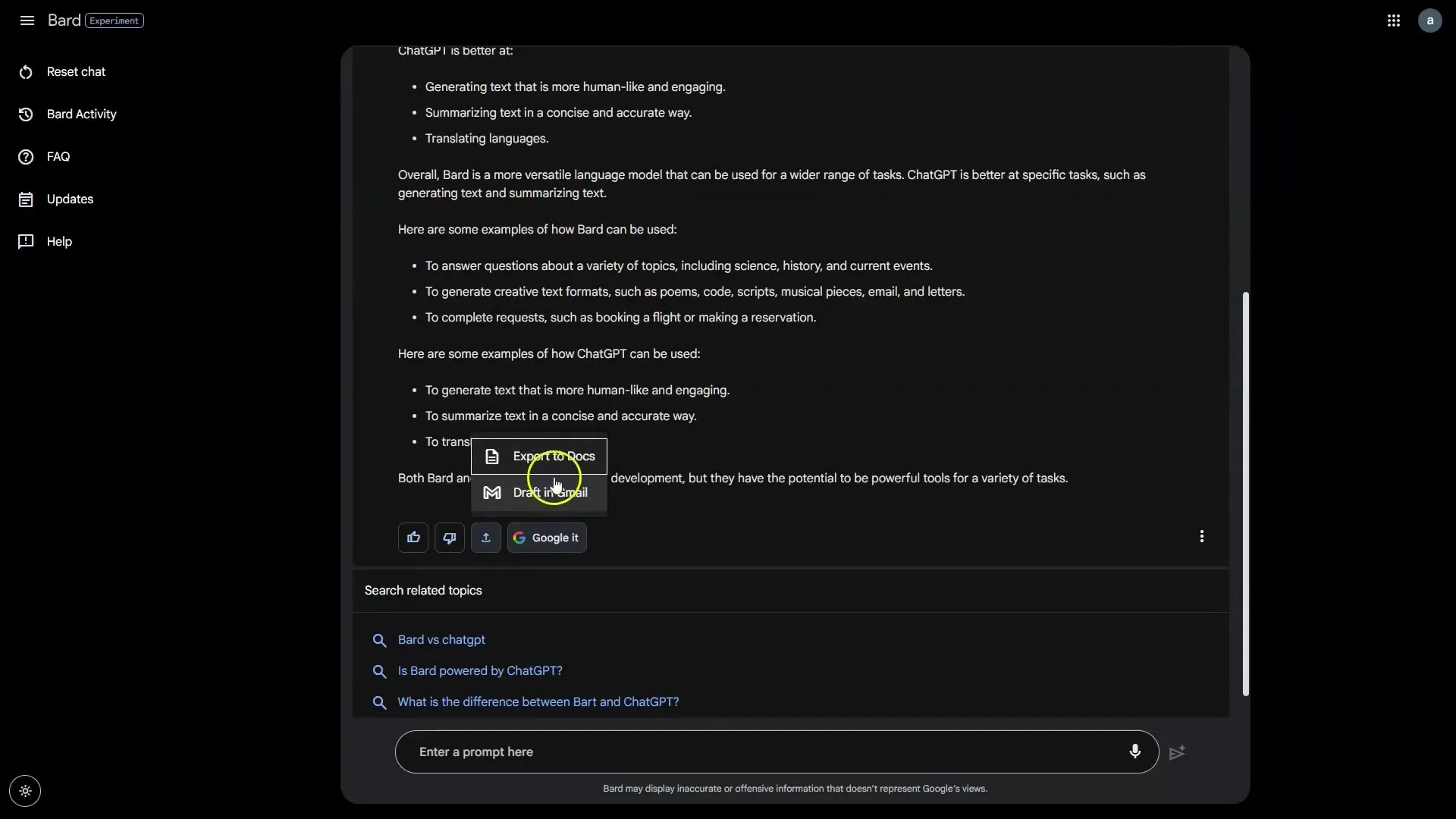 Vær opmærksom på, at Bard og ChatGPT har forskellige styrker. Mens Bard er mere kreativ med usædvanlige spørgsmål, er ChatGPT ofte bedre til oversættelser og sammenfatninger. Dette kan du finde ud af gennem egne tests.
