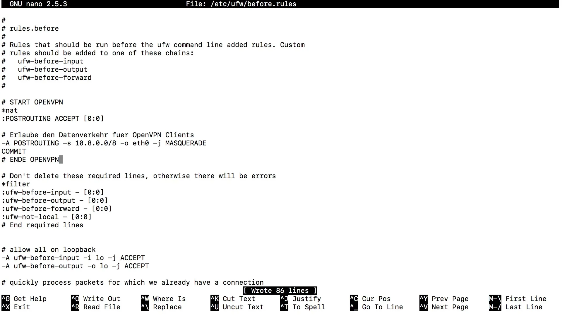 Hvad gør jeg, hvis firewallen er for restriktiv?Sørg for, at standardpolitikken for viderekobling er sat til ACCEPT. Tjek også de specifikke regler for OpenVPN i UFW.