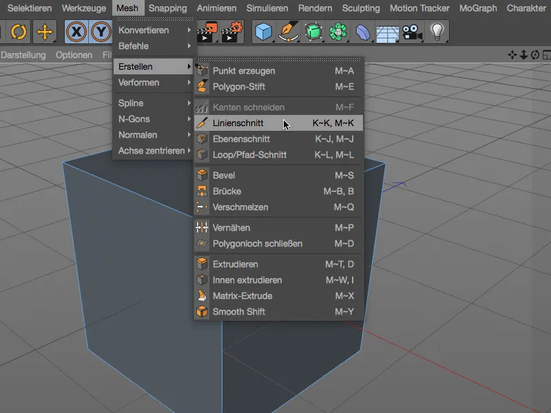 Som I kan se i menuen, kan de tre knivværktøjer åbnes med to hierarkiske tastaturgenveje hver. Enten sammen med de andre modelleringsværktøjer ved at trykke på tasten M …