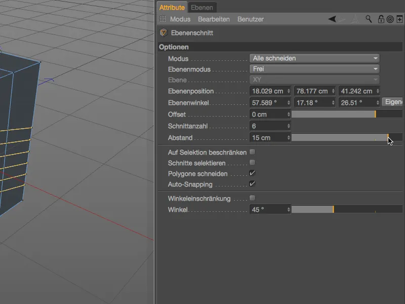 Først vender vi dog tilbage til vores polygonvinkel for at se nærmere på værktøjets grundlæggende funktion. Lige efter værktøjet er aktiveret, bemærker vi HUD-stangen oven på det sektionerede objekt. Den kan flyttes til en vilkårlig position i redigeringsvisningen med musen og kan justeres til ønsket længde ved hjælp af de to anførere til venstre og højre.