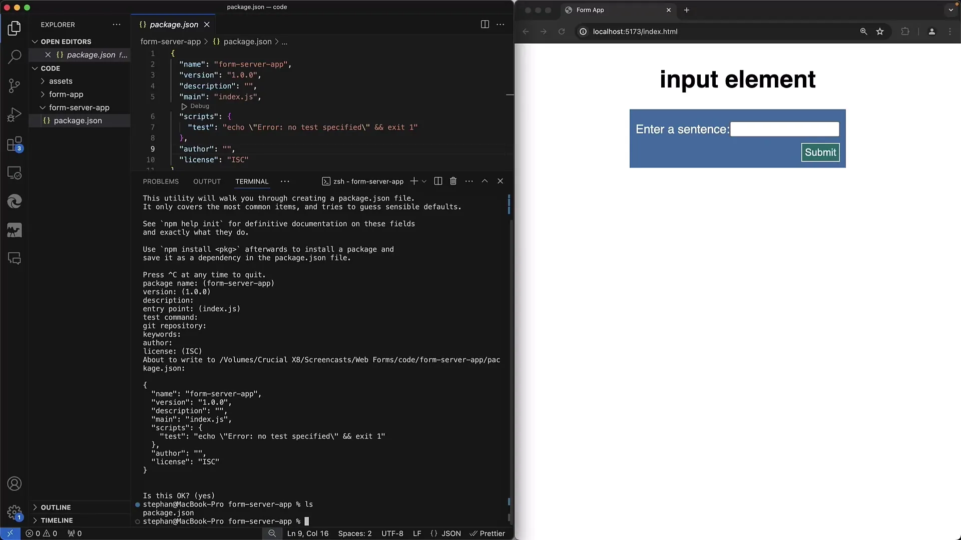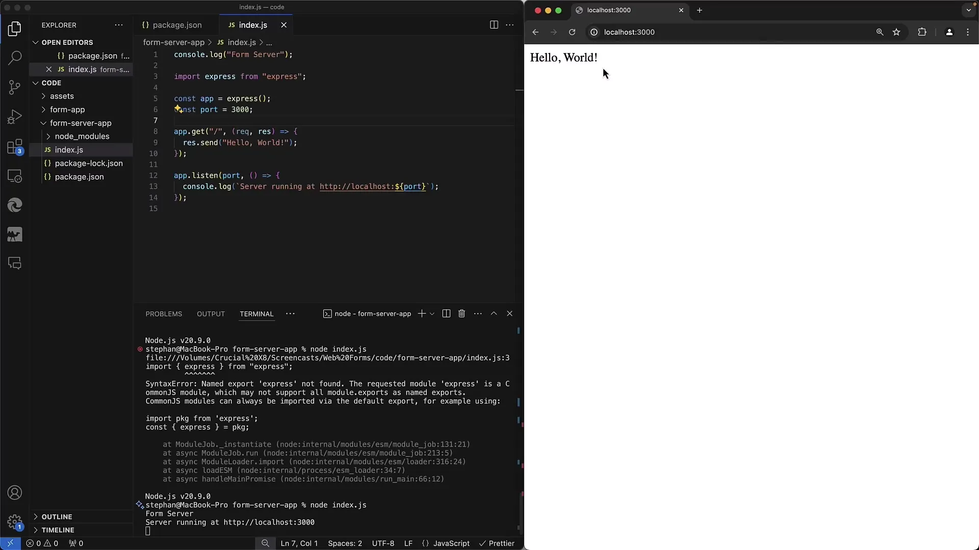 I begyndelsen kan du foretage en kort test ved at skrive console.log("FormServer"); i index.js-filen og køre denne med node index.js for at sikre, at alt fungerer.