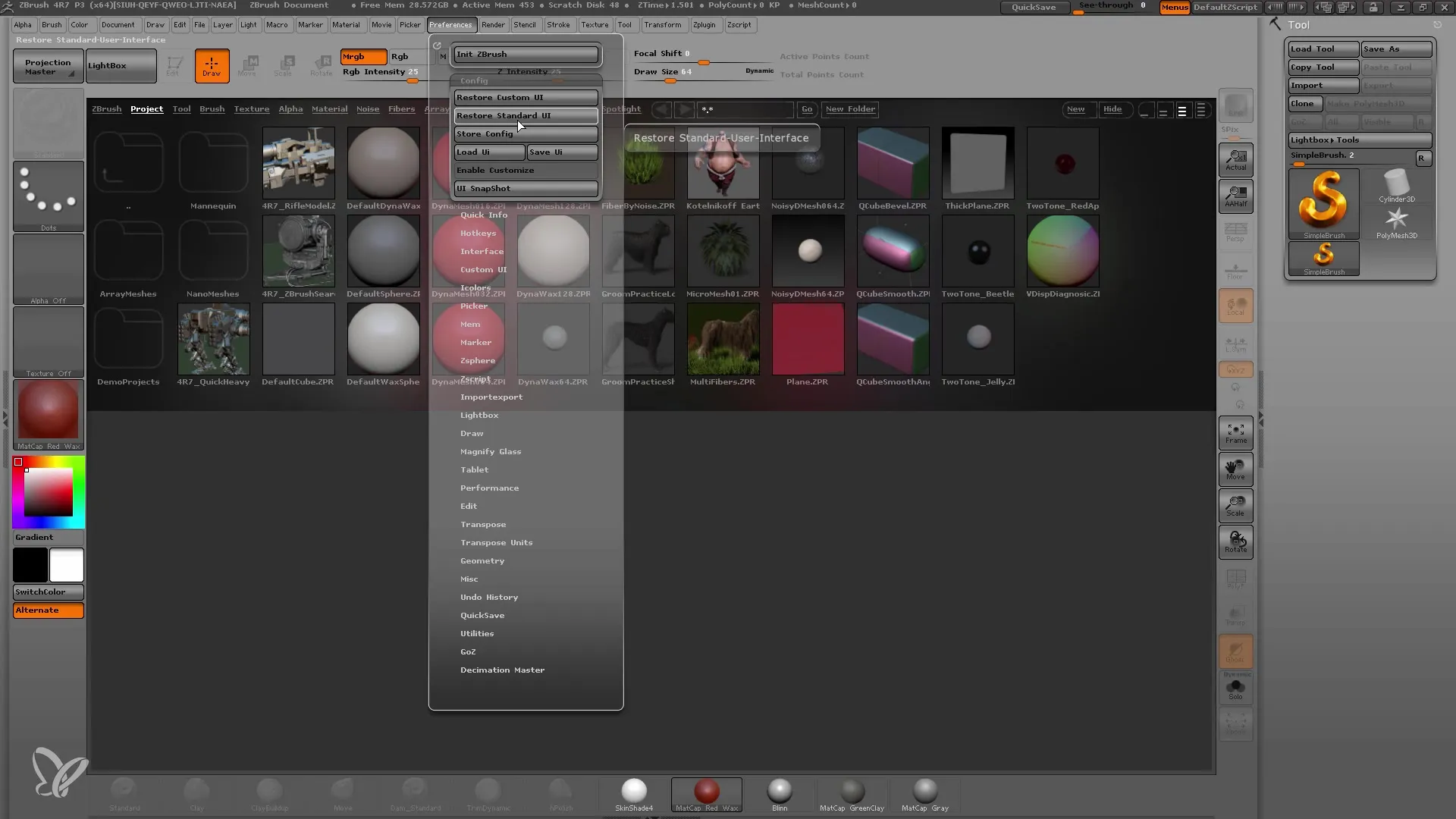 Yderligere nyttige funktioner er "Restore Standard UI" og "Init Brushes". Med disse kan du nulstille din nuværende brugergrænseflade eller nulstille alle pensel- og materialeindstillinger til standardværdierne.