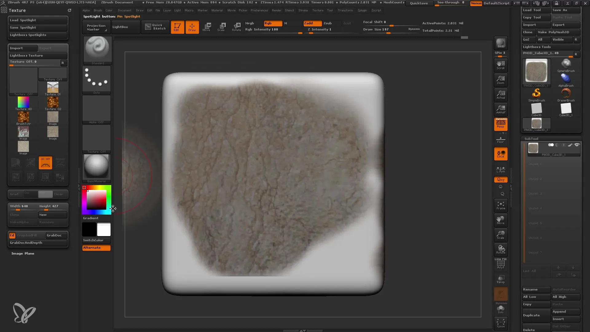 - Modellering med Spotlight Spotlight muliggør ikke kun teksturering, men også seriøs modellering. Vær opmærksom på at vælge en ikke for høj intensitet for at undgå forvrængninger.