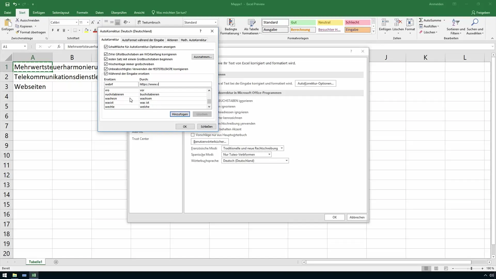 Hvis du ofte indtaster webadresser, kan du også inkludere dem i autokorrektur. Indtast f.eks. din egen hjemmeside som "https://www.renefürst.eu", og opret en simpel forkortelse som "webrf". Denne forkortelse vil derefter automatisk blive omsat til den indtastede webadresse.