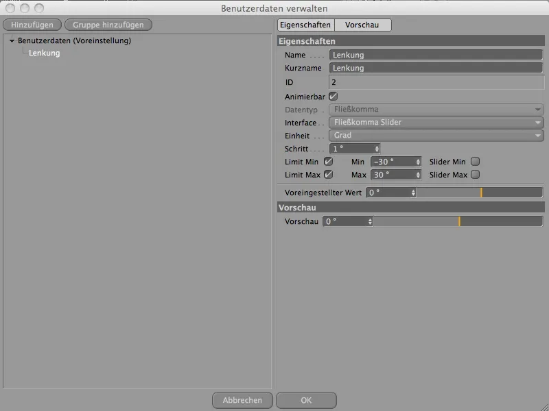 Til vores eksempel er en simpel styremulighed til venstre eller højre ved hjælp af en skydekontrol tilstrækkelig. Da vi egentlig burde styre to objekter (hjulene eller konnektorerne), men kun ønsker en behagelig kontrol, integrerer vi bare vores egen styreparameter i form af brugerdata.