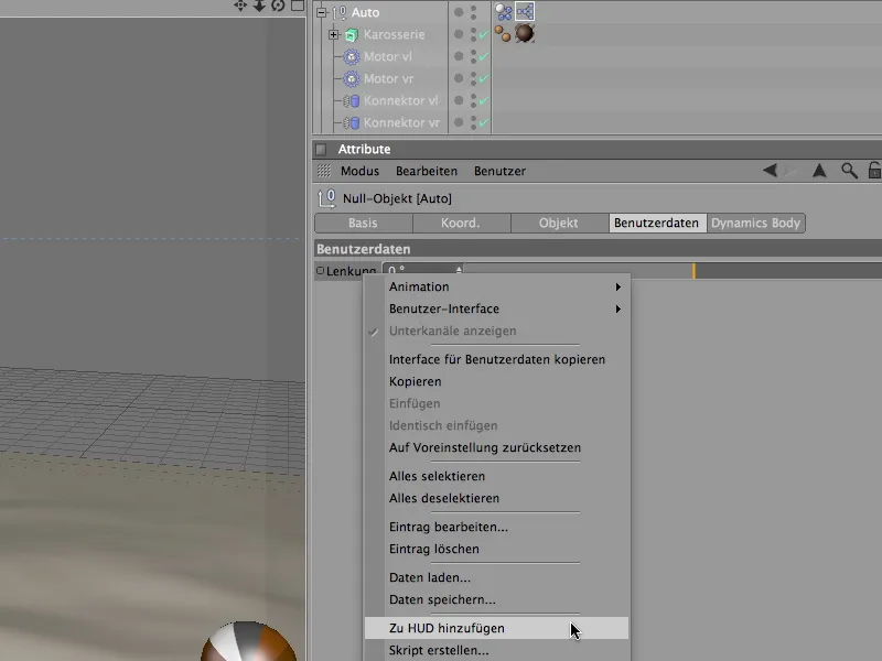 Vores lille udflugt i XPresso er desværre allerede overstået, så vi kan lukke XPresso-editoren. For at undgå at skulle lede efter nullobjekt og dets brugerdata-post konstant for at styre bilen, integrerer vi simpelthen skyderkontrollen i editorens head-up-display (HUD).