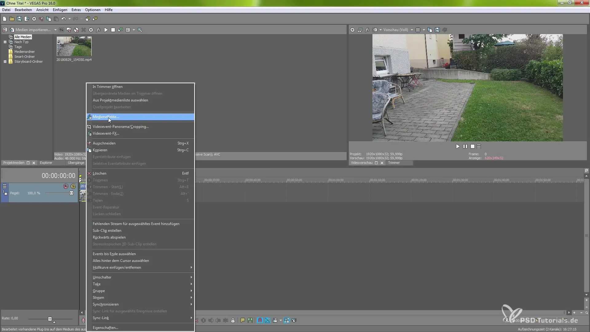 Det første skridt er at importere videoen til dit projekt. Højreklik på optagelsen og vælg indstillingen for medieeffekter. Dette åbner en ny menu, hvor du kan finde stabiliseringsfunktionen. Du scroller helt til højre og søger efter plugin'et til Vegas videostabilisering. Vælg denne indstilling og bekræft dit valg.
