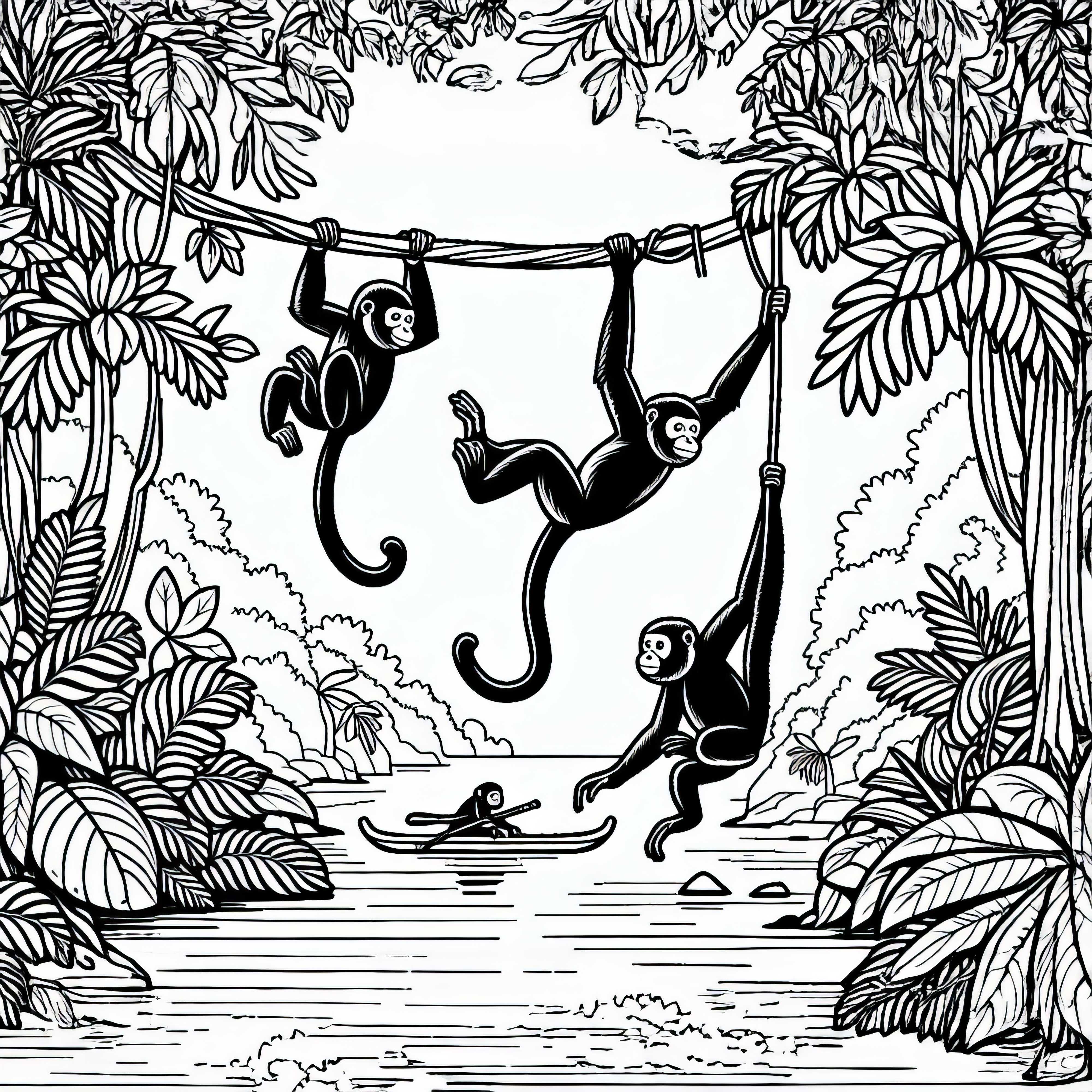 Ein brüllender Affe beobachtet neugierig eine Schlange am Boden – Ausmalbild zum Download