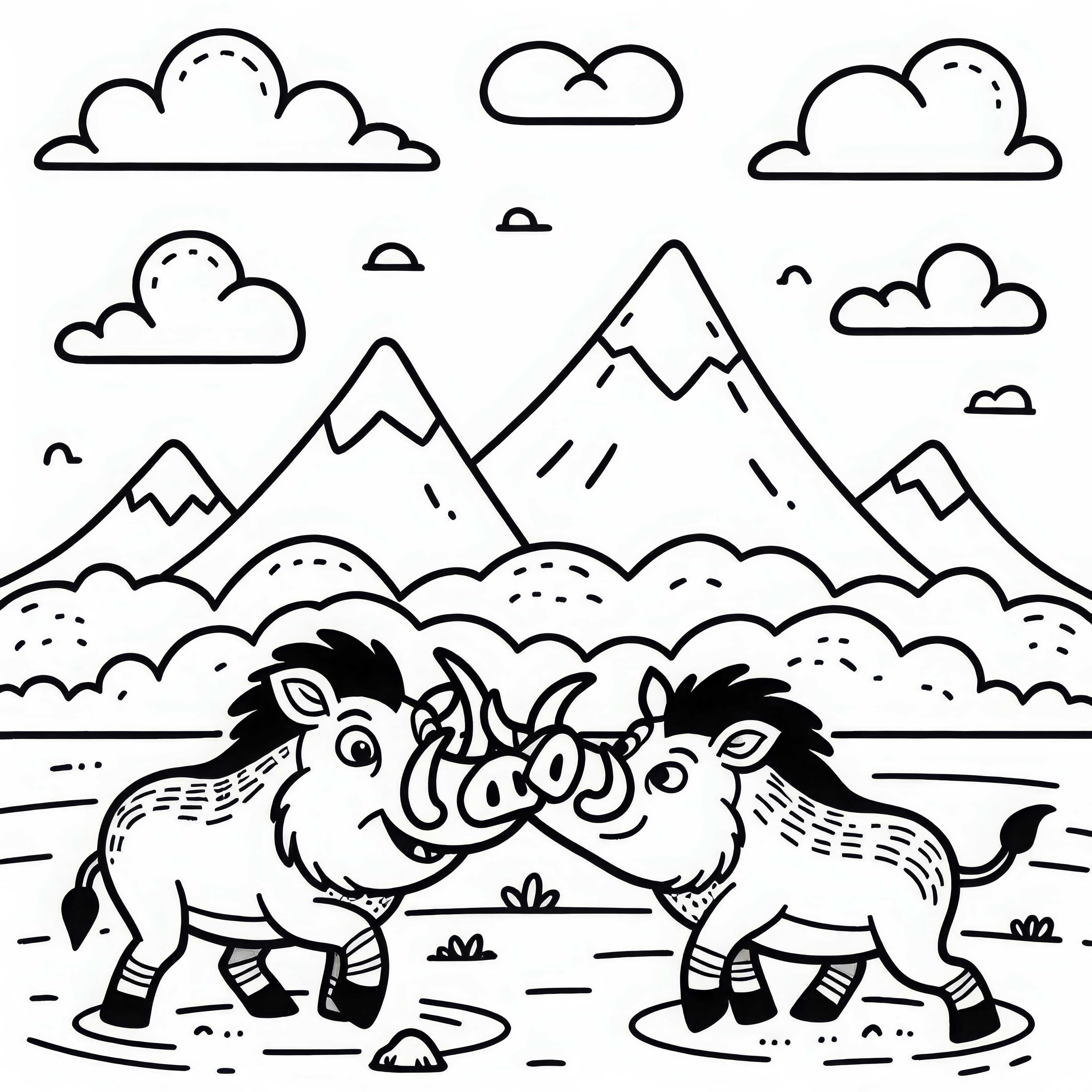 Auf diesem Ausmalbild sieht man zwei Warzenschweine, die spielerisch miteinander kämpfen. Dies bietet eine unterhaltsame Möglichkeit, deine Kreativität auszuleben und die Farbpalette ganz nach deinem Geschmack zu gestalten. Das Bild kann kostenlos heruntergeladen werden, und es steht dir in hoher Qualität als JPG-Datei zur Verfügung. Du kannst das Ausmalbild entweder ausdrucken und traditionell mit Buntstiften oder Filzstiften ausmalen oder online direkt am Bildschirm kreativ werden. Lade dir das Ausmalbild jetzt herunter und genieße das kreative Ausmalvergnügen!