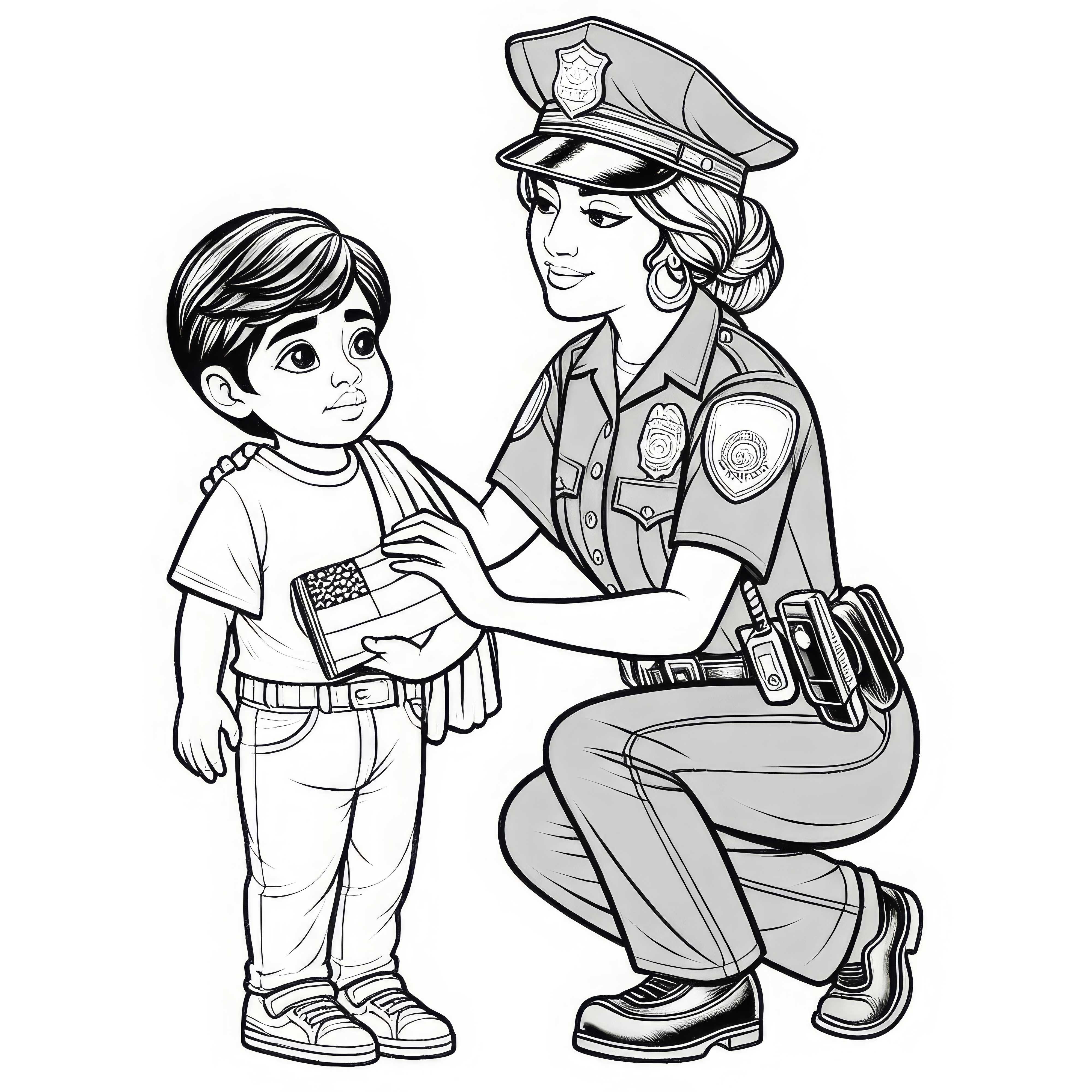 Polizistin und verdächtiger Charakter – Ausmalbild kostenlos