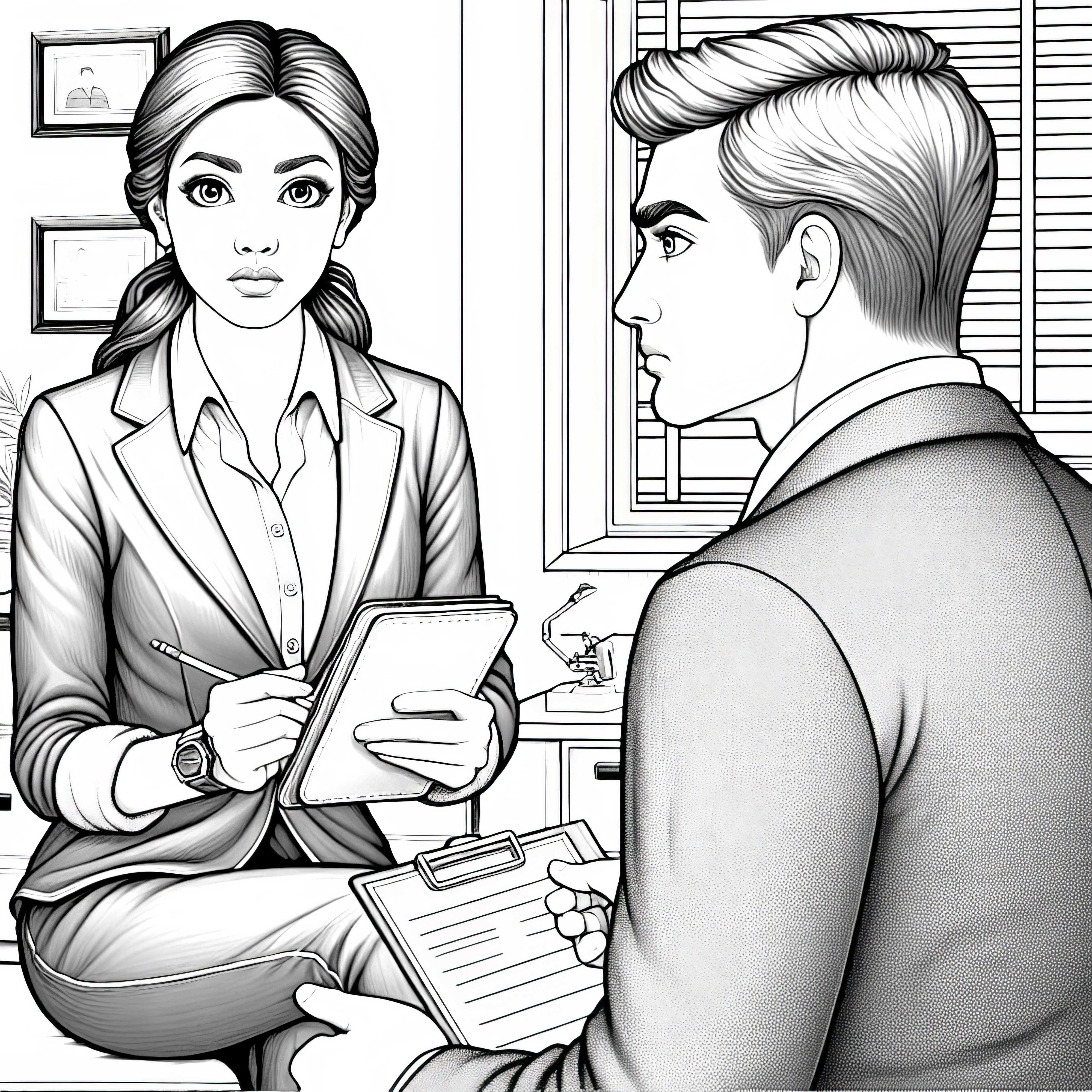 Detektivin bei Befragung eines Verdächtigen – Ausmalbild zum kostenlosen Download