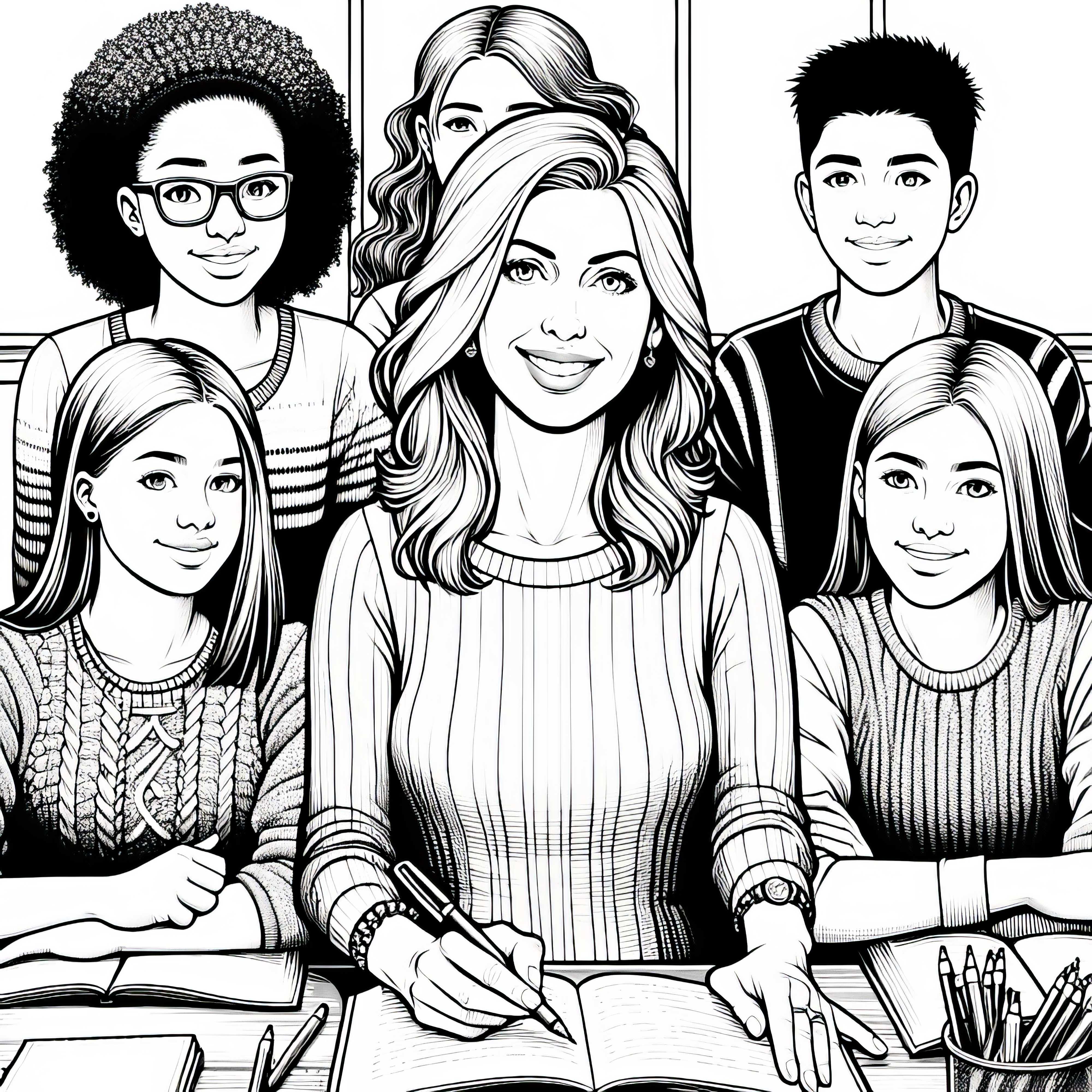 Klasse am Gymnasium mit Lehrer – Ausmalbild für Kinder