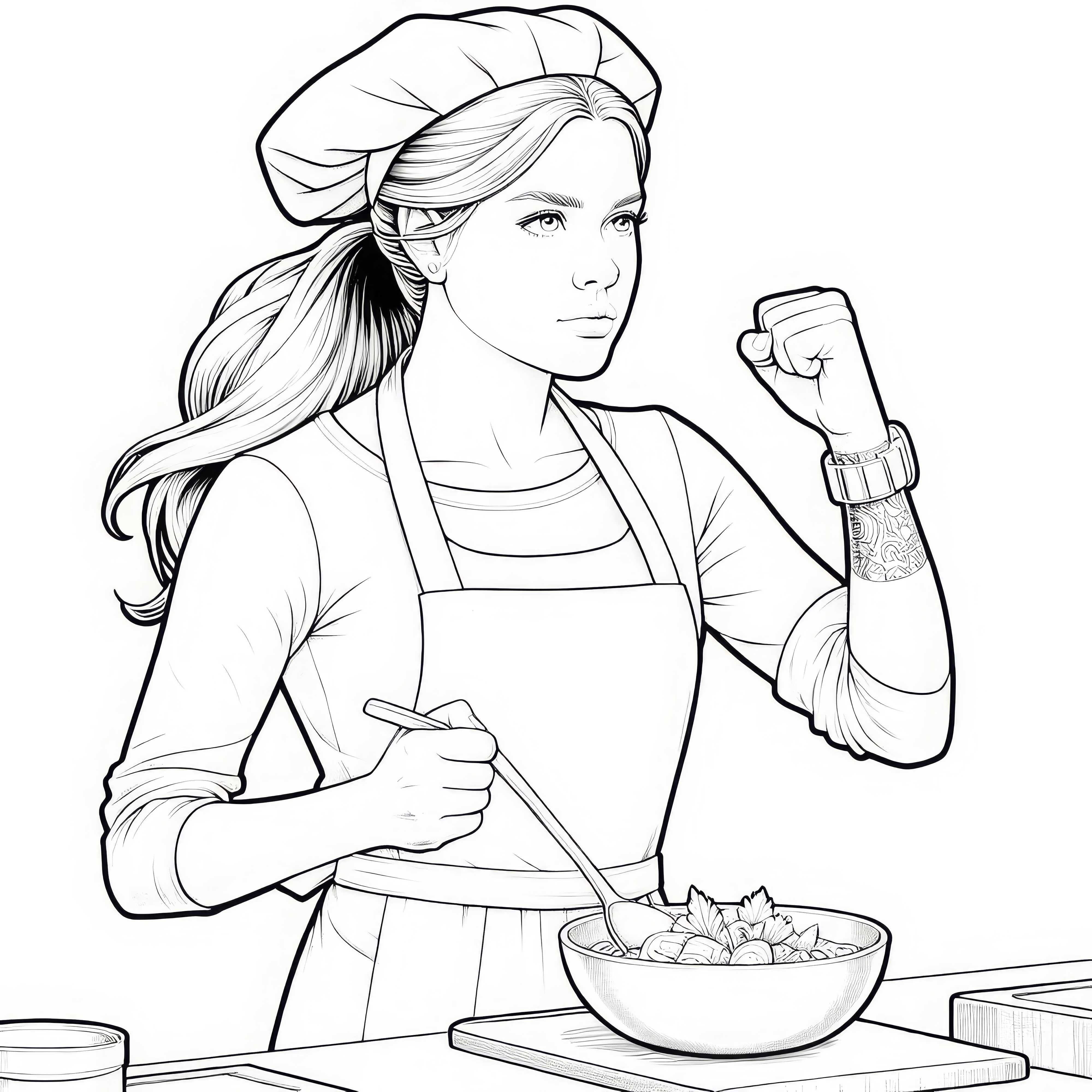 Köchin im Restaurant mit Pflanzen: Neue Rezepte als Ausmalbild – Detailreich und Kostenlos