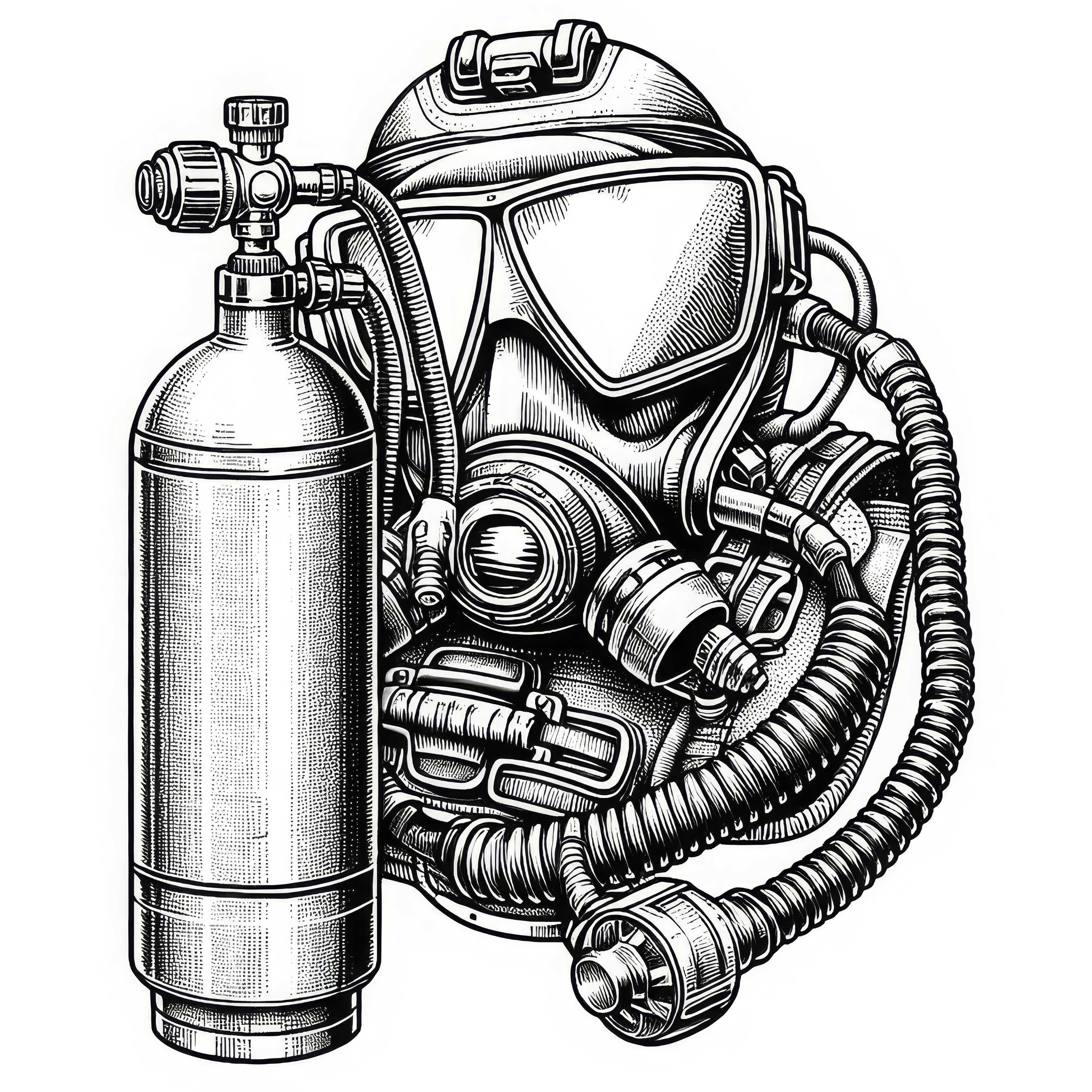 Ausmalbild einer Sauerstoffflasche und eines Atemreglers für Taucher – Kostenlos und Einfach