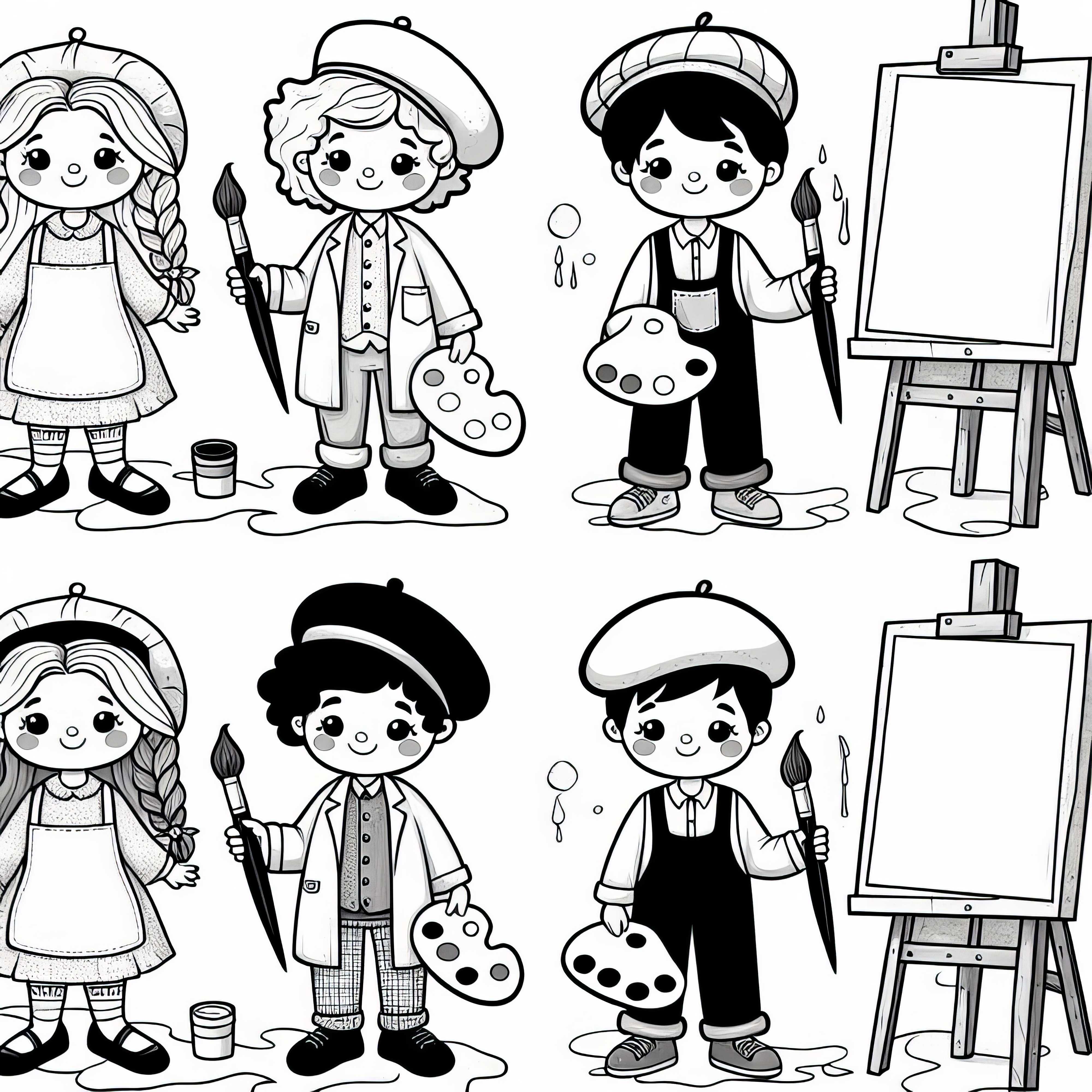 Maler im Atelier mit Skizzen und Leinwänden – Ausmalbild gratis