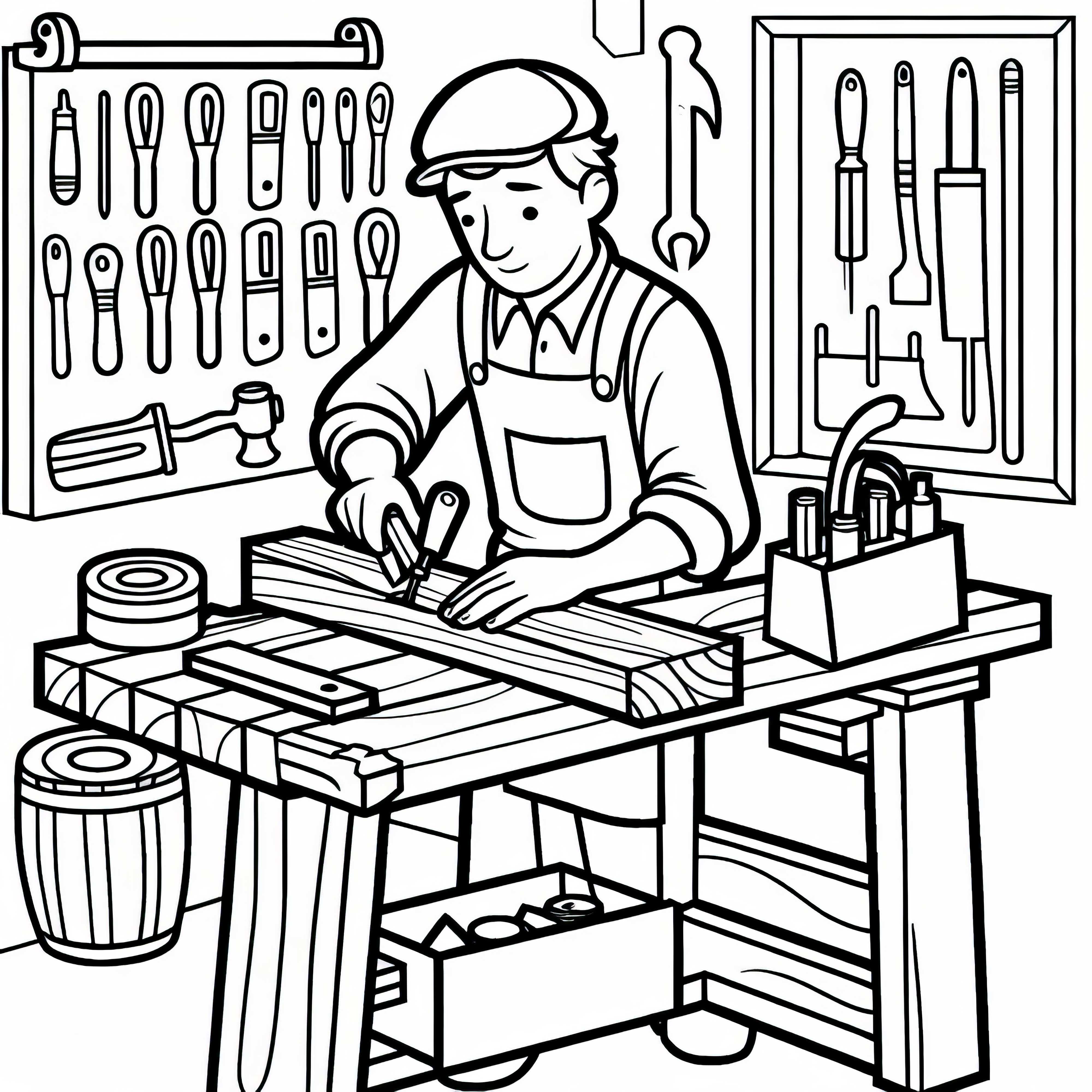 Schreinerin stellt Holzmöbel in Werkstatt her – Ausmalbild kostenlos