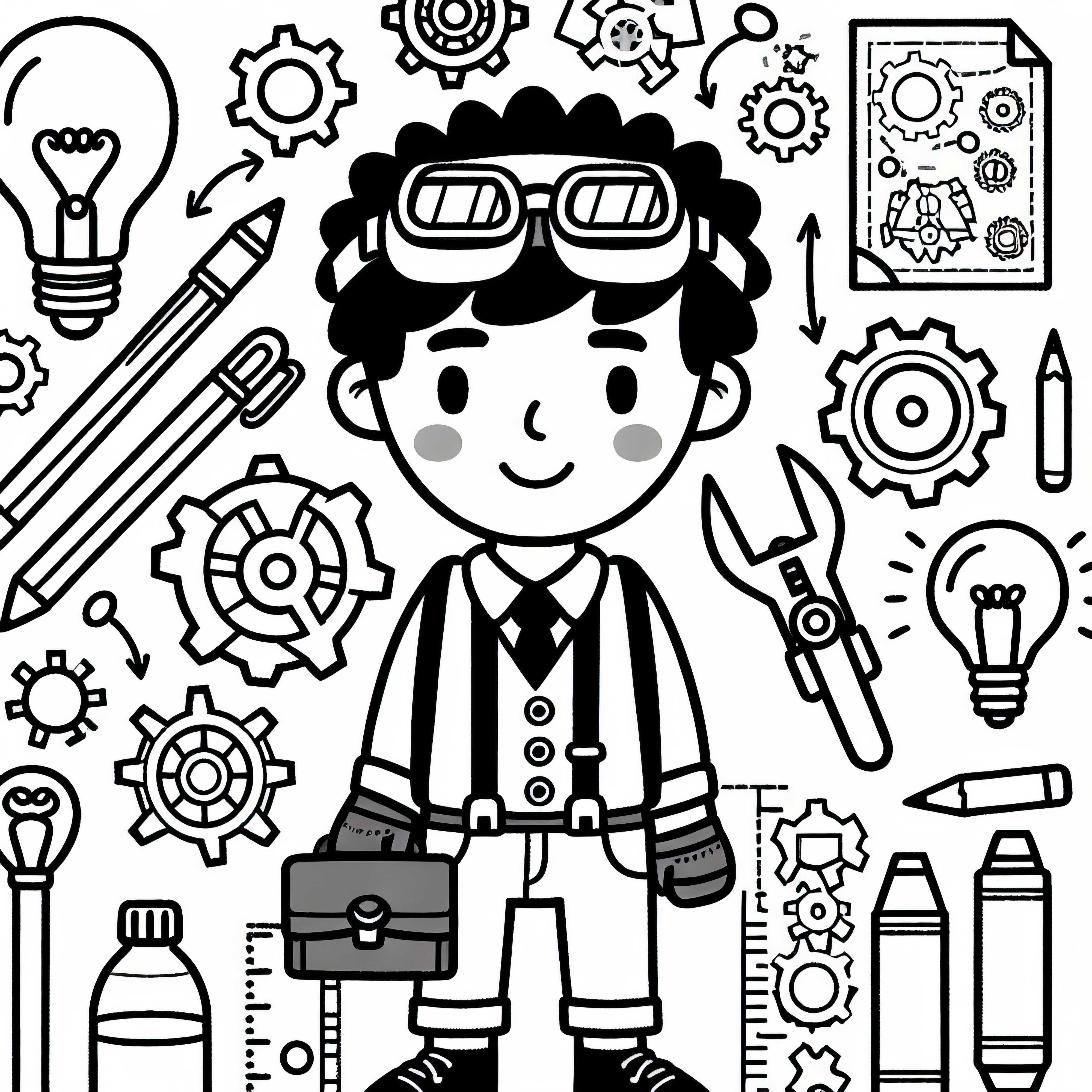 Erfinder kombiniert verschiedene Bauteile für neue Erfindung – Ausmalbild kostenlos