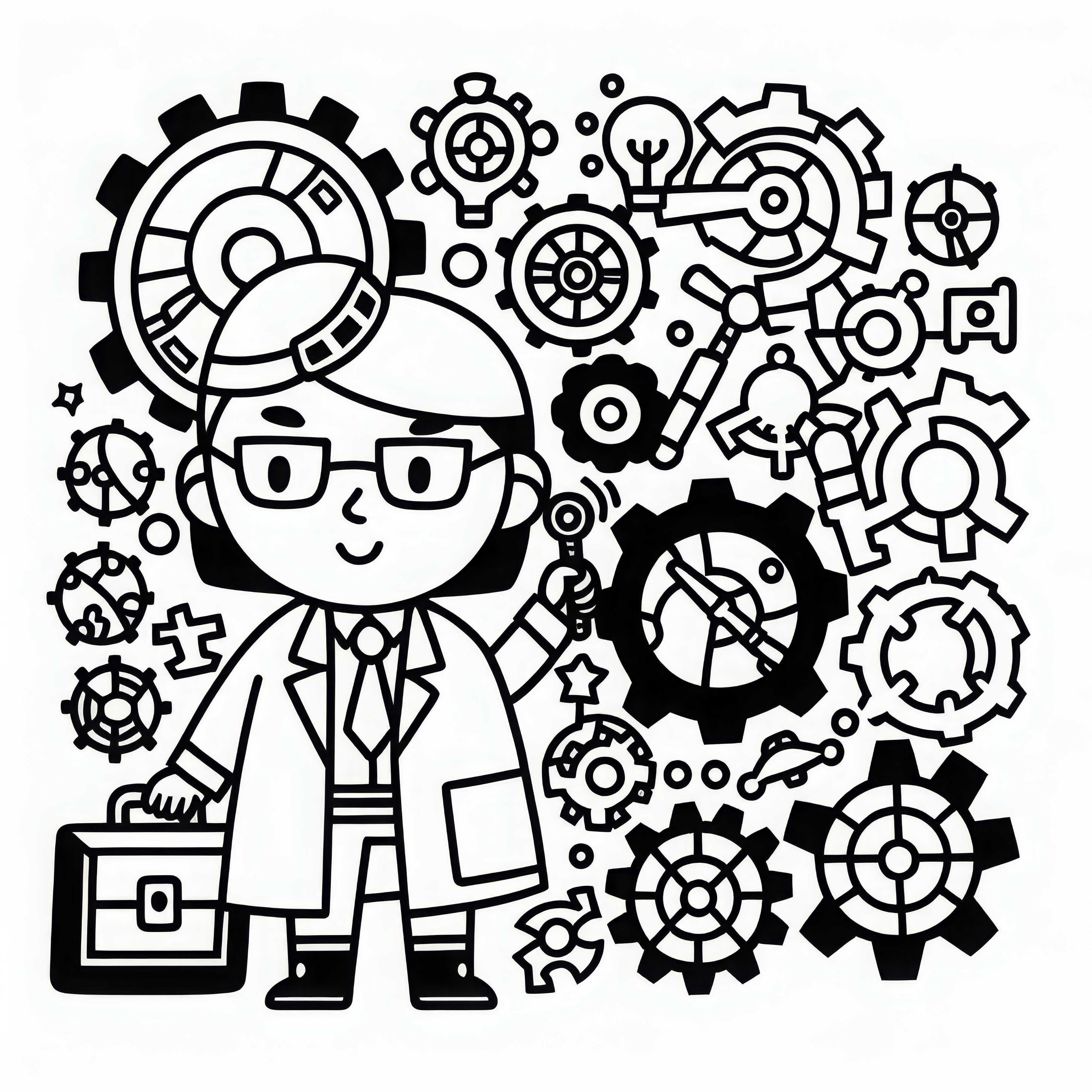 Erfinder testet Prototyp in der Werkstatt – Ausmalbild gratis
