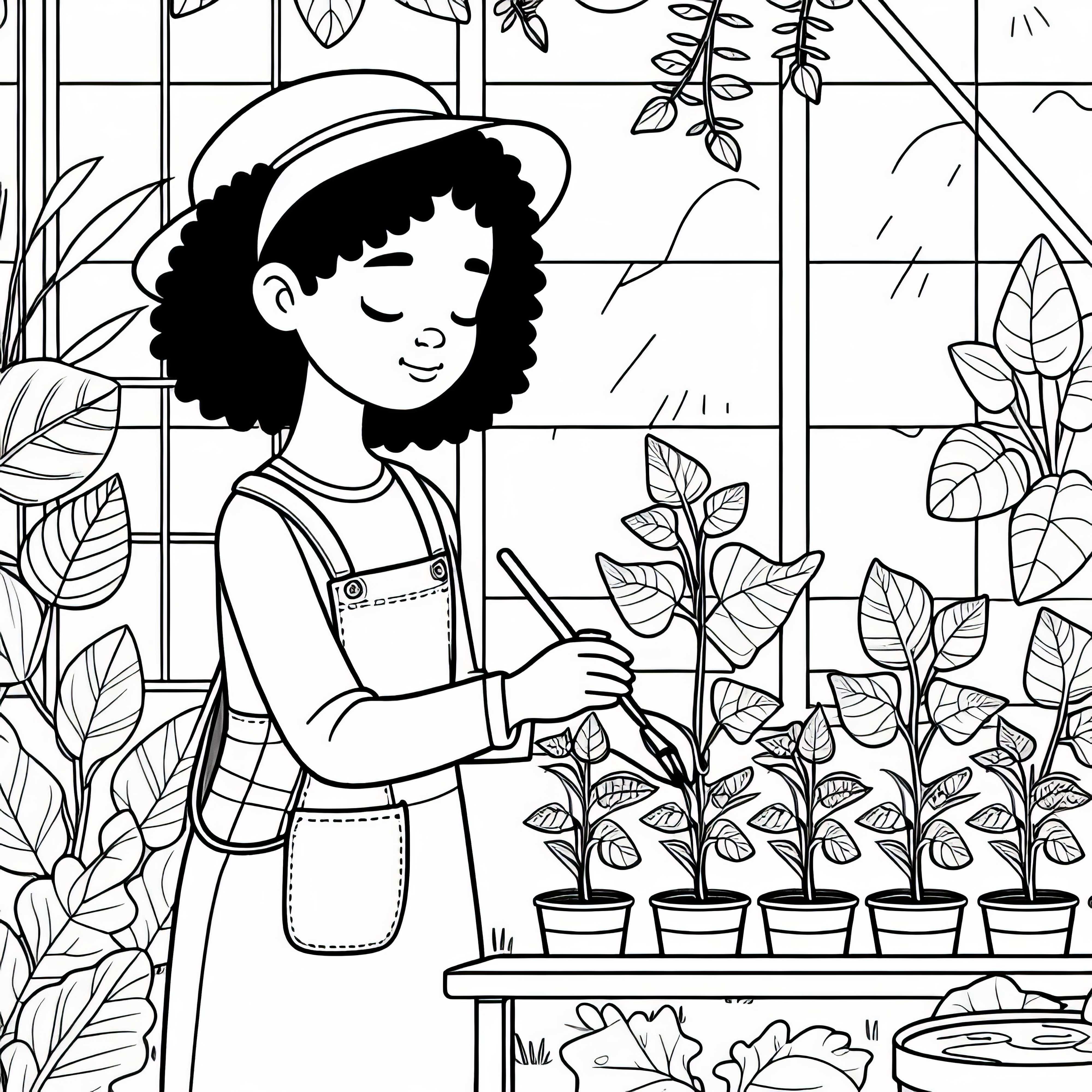 Malvorlage zur Landwirtin mit Pflanzen im Gewächshaus
