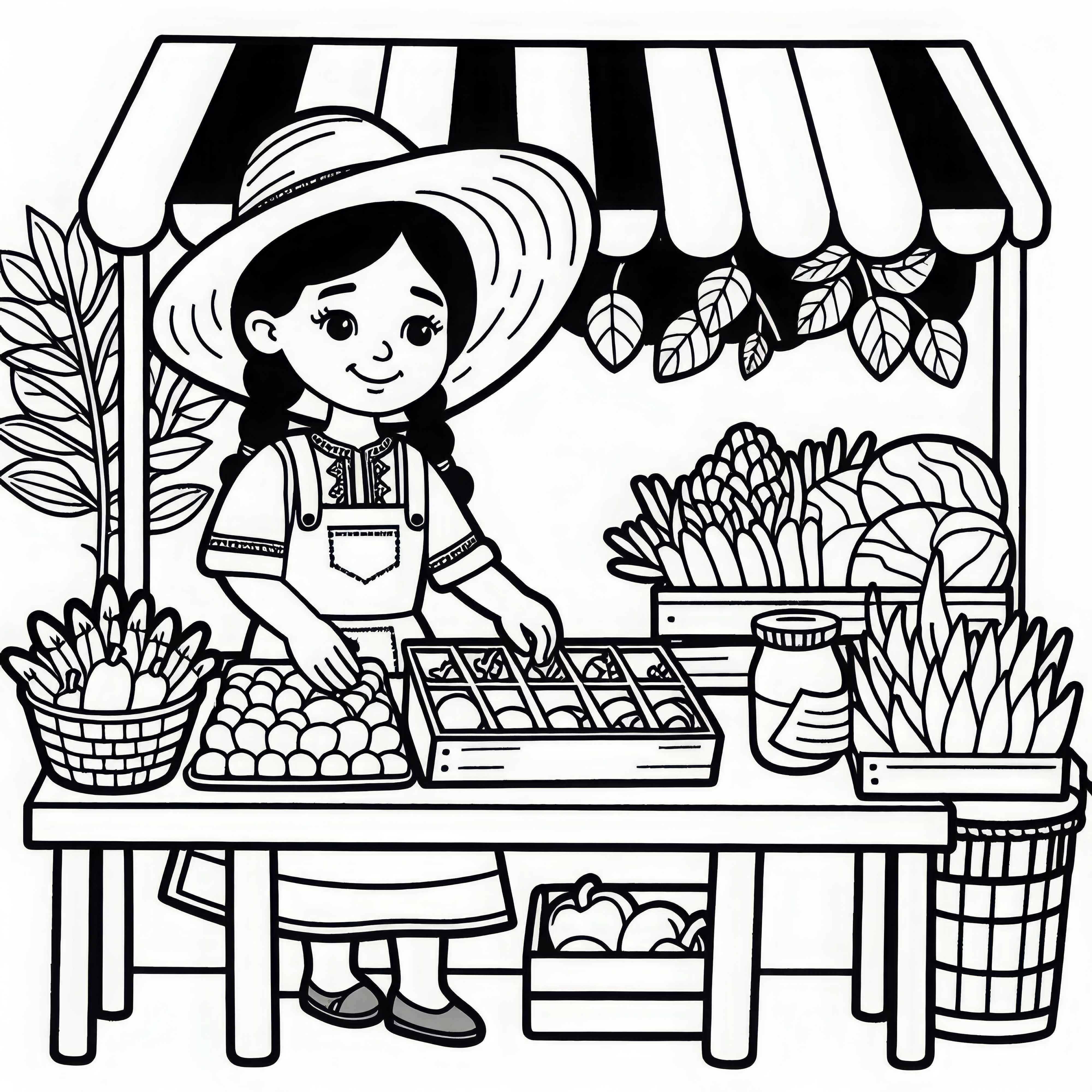 Ausmalbild einer Bäuerin am Marktstand mit frischen Produkten – detailreich und gratis