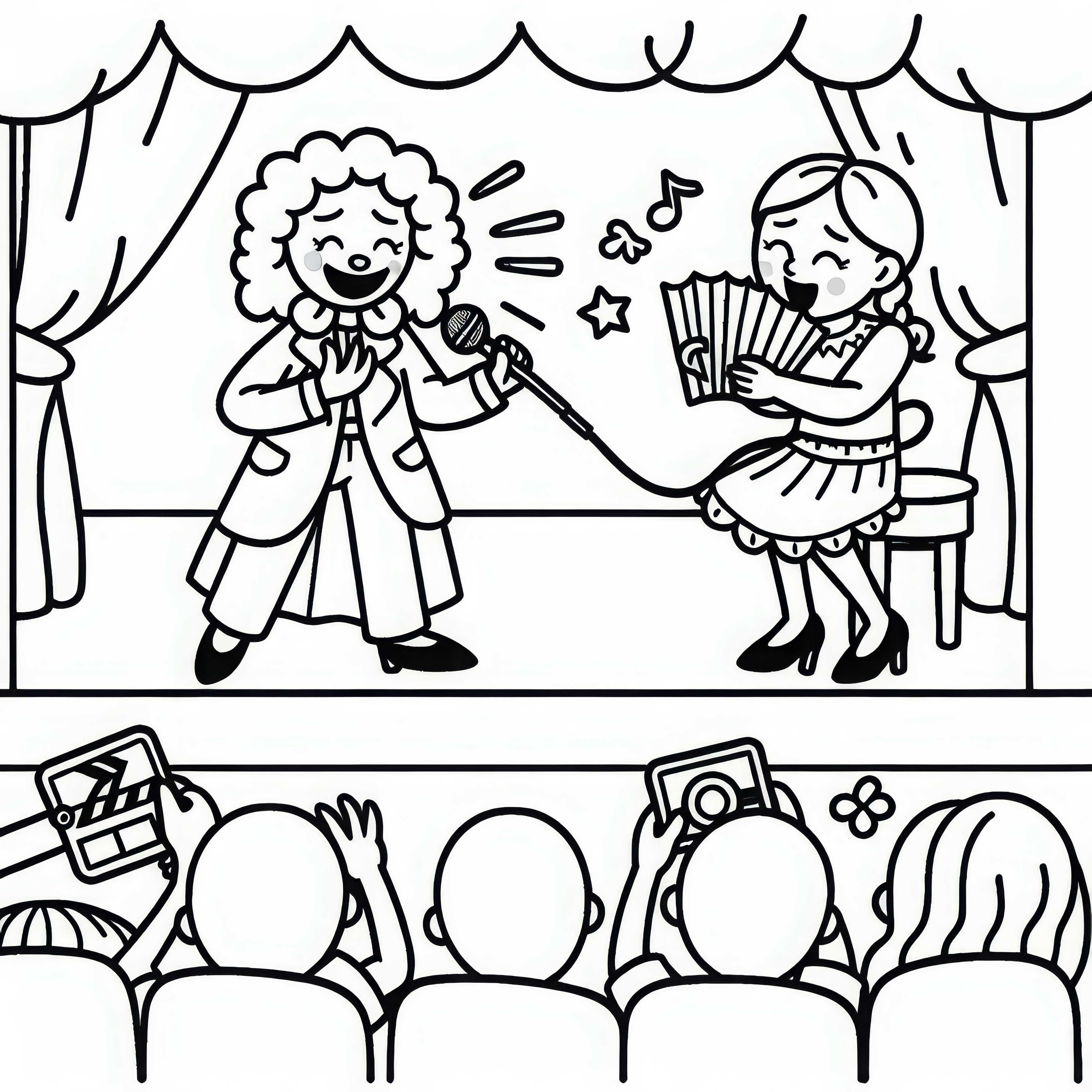 Schauspieler auf Theaterbühne in dramatischer Szene – Ausmalbild kostenlos herunterladen