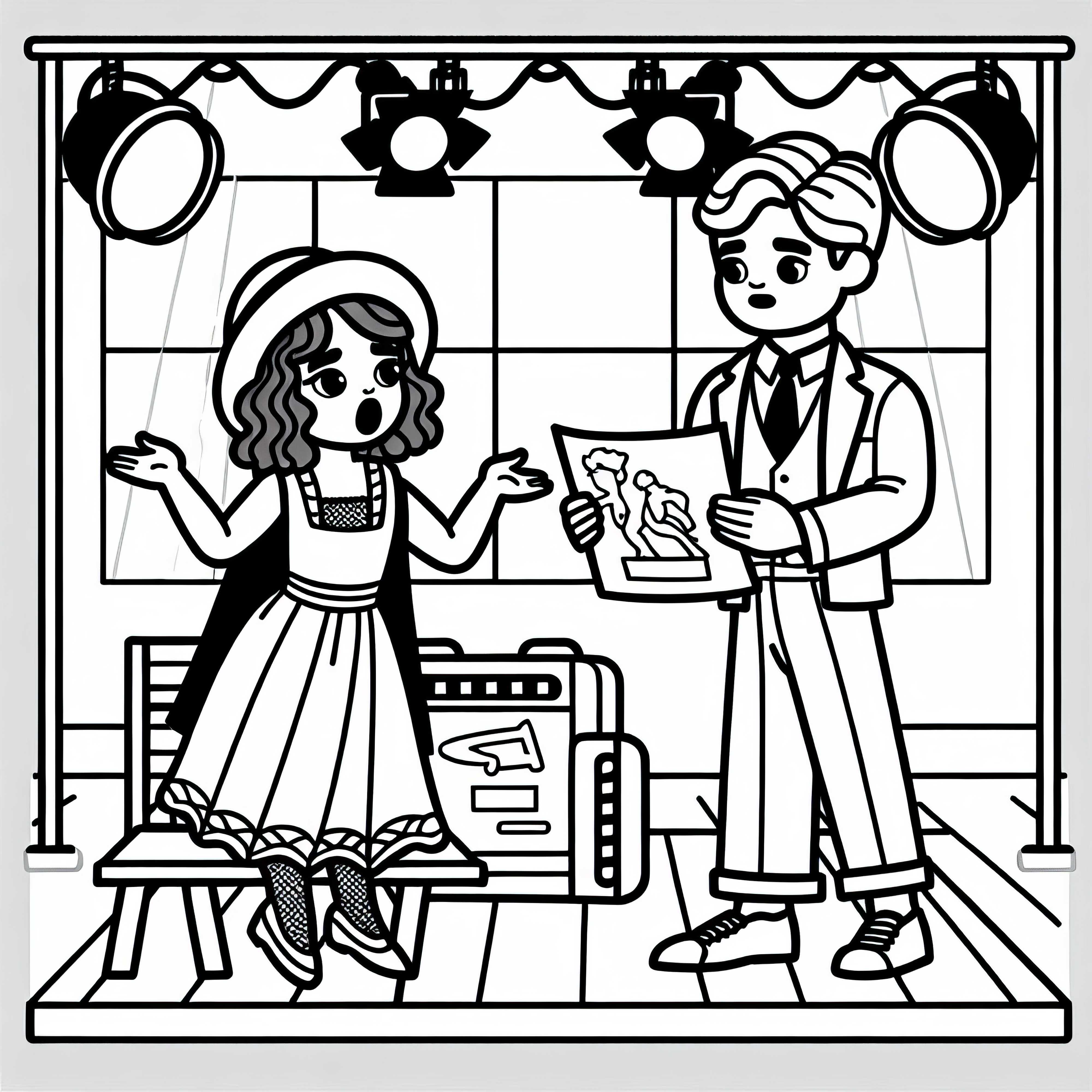 Schauspieler auf Theaterbühne in dramatischer Szene – Ausmalbild kostenlos herunterladen