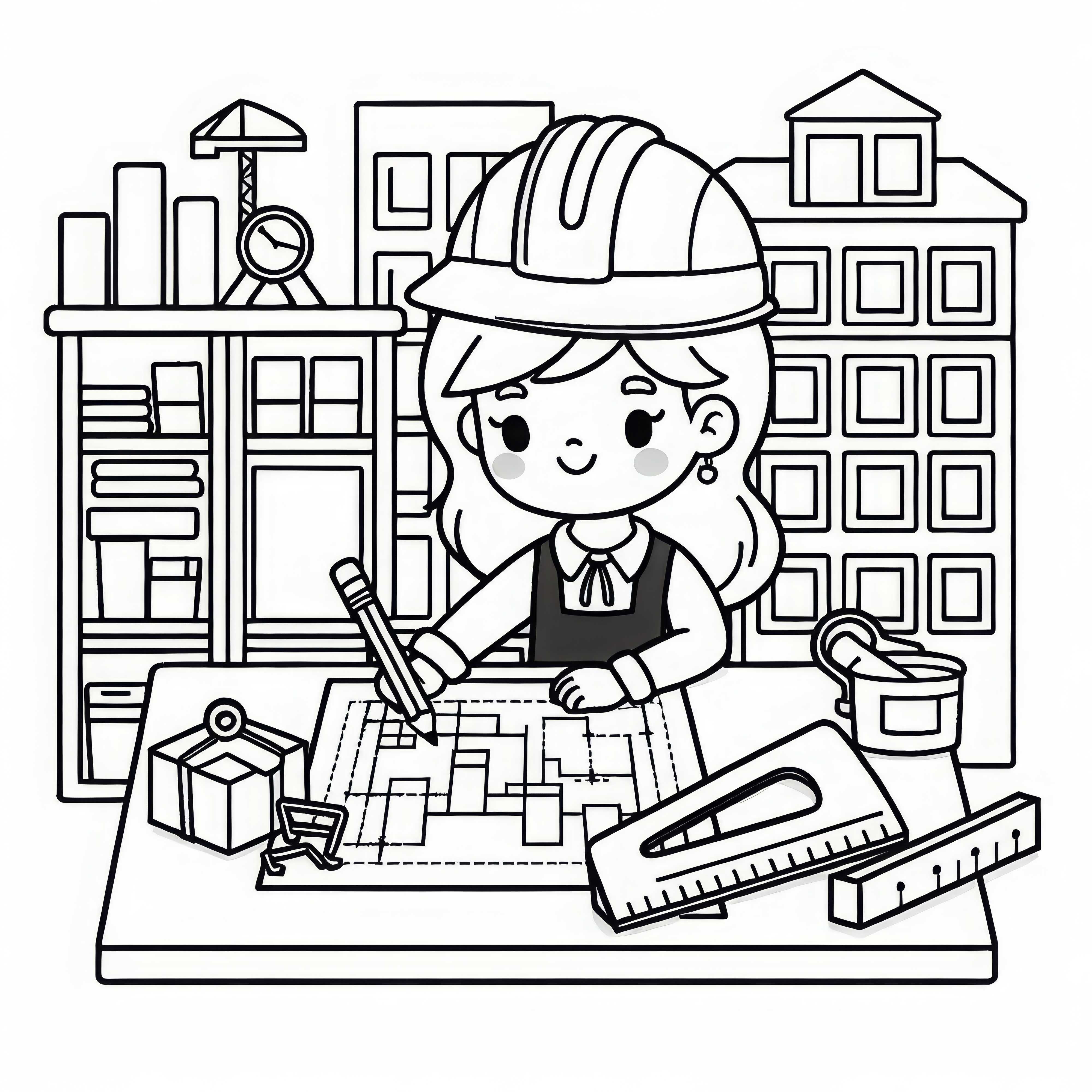 Architektin arbeitet an Gebäudeentwurf – Ausmalbild kostenlos