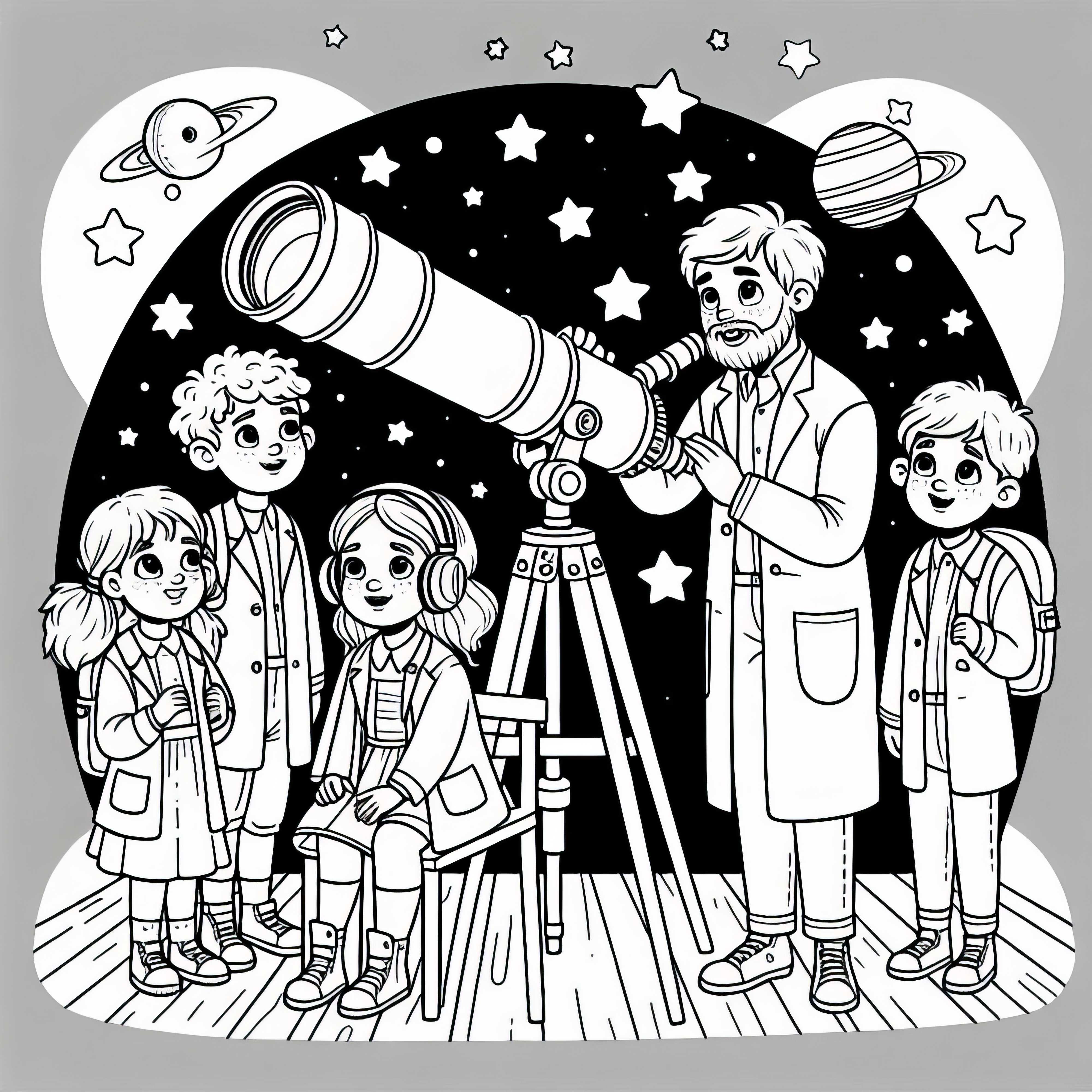 Astronomin spricht mit Schülern über das Universum – Ausmalbild kostenlos