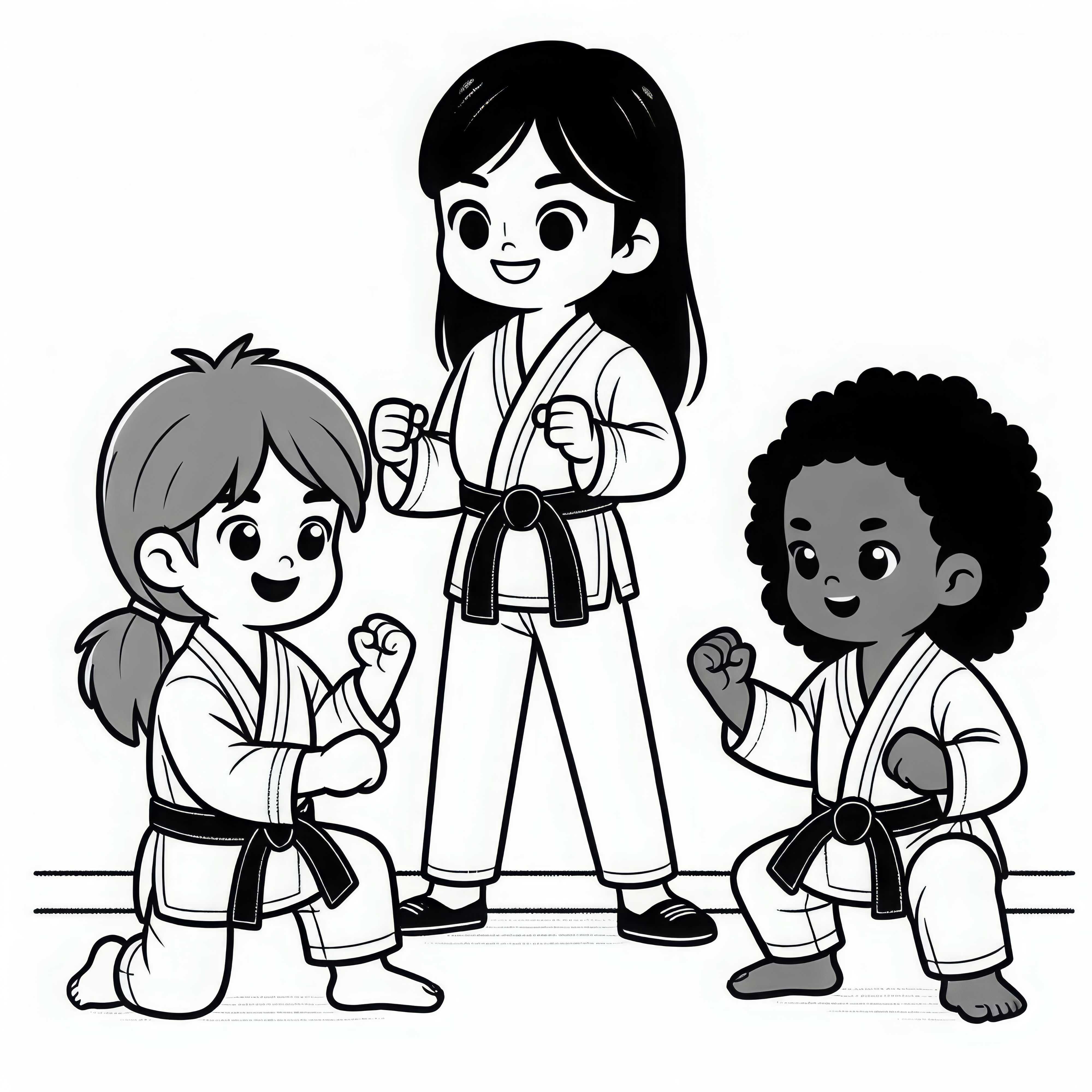 Karatetrainerin bereitet Schüler auf Wettkampf vor – Malvorlage kostenlos