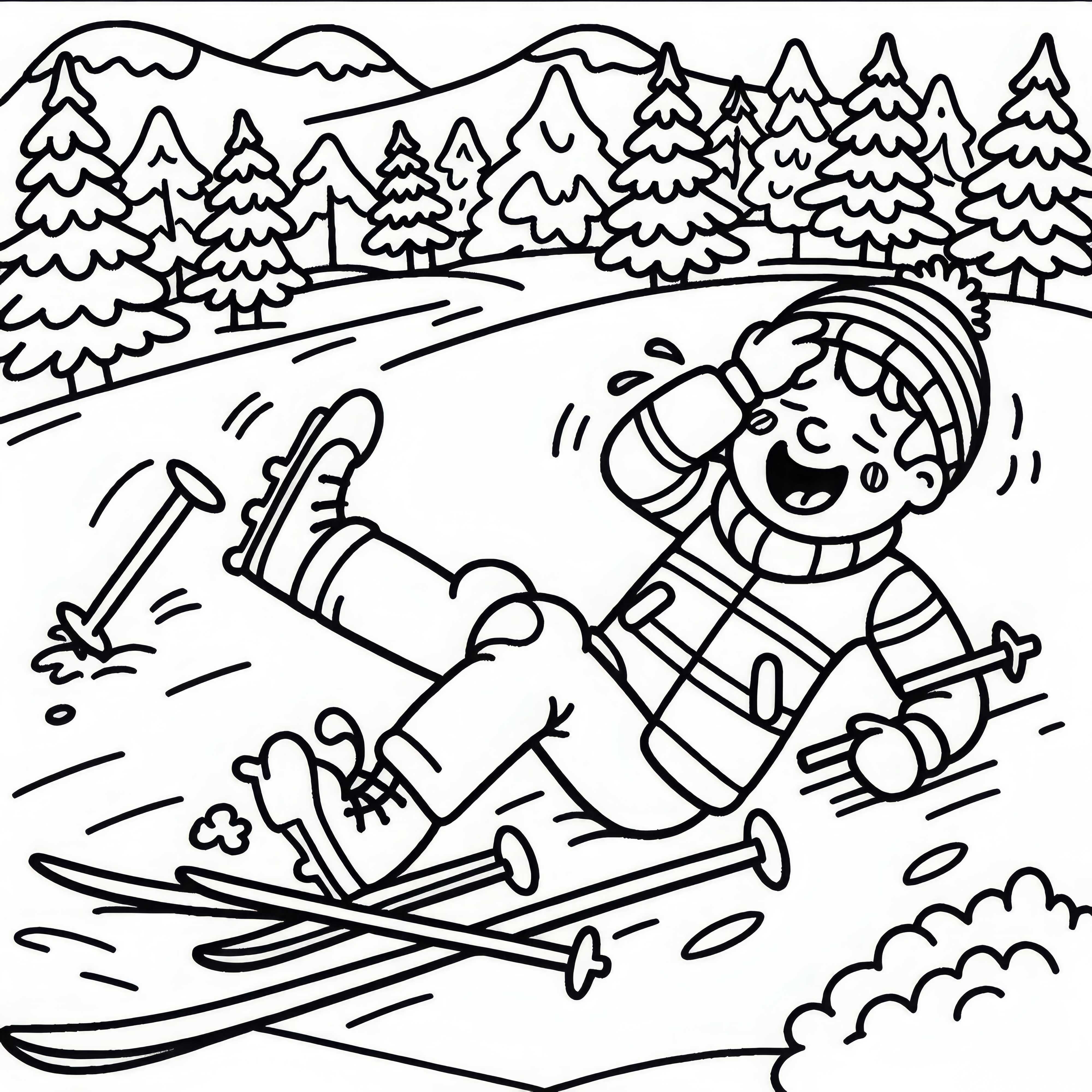 Skilangläufer verliert die Balance und fällt lachend in den Schnee – Malvorlage gratis