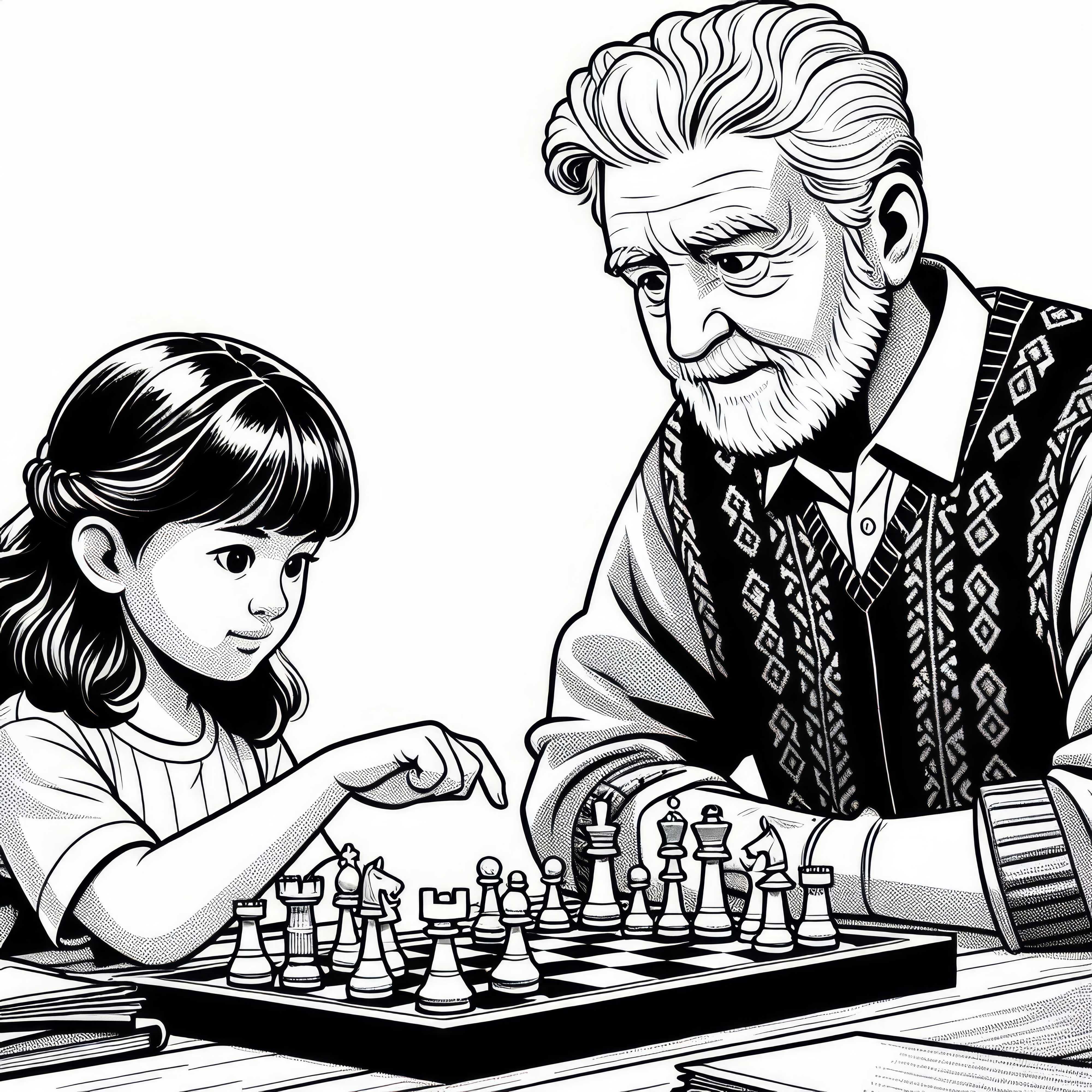 Schachspielerin setzt strategischen Zug und lächelt – Ausmalbild kostenlos