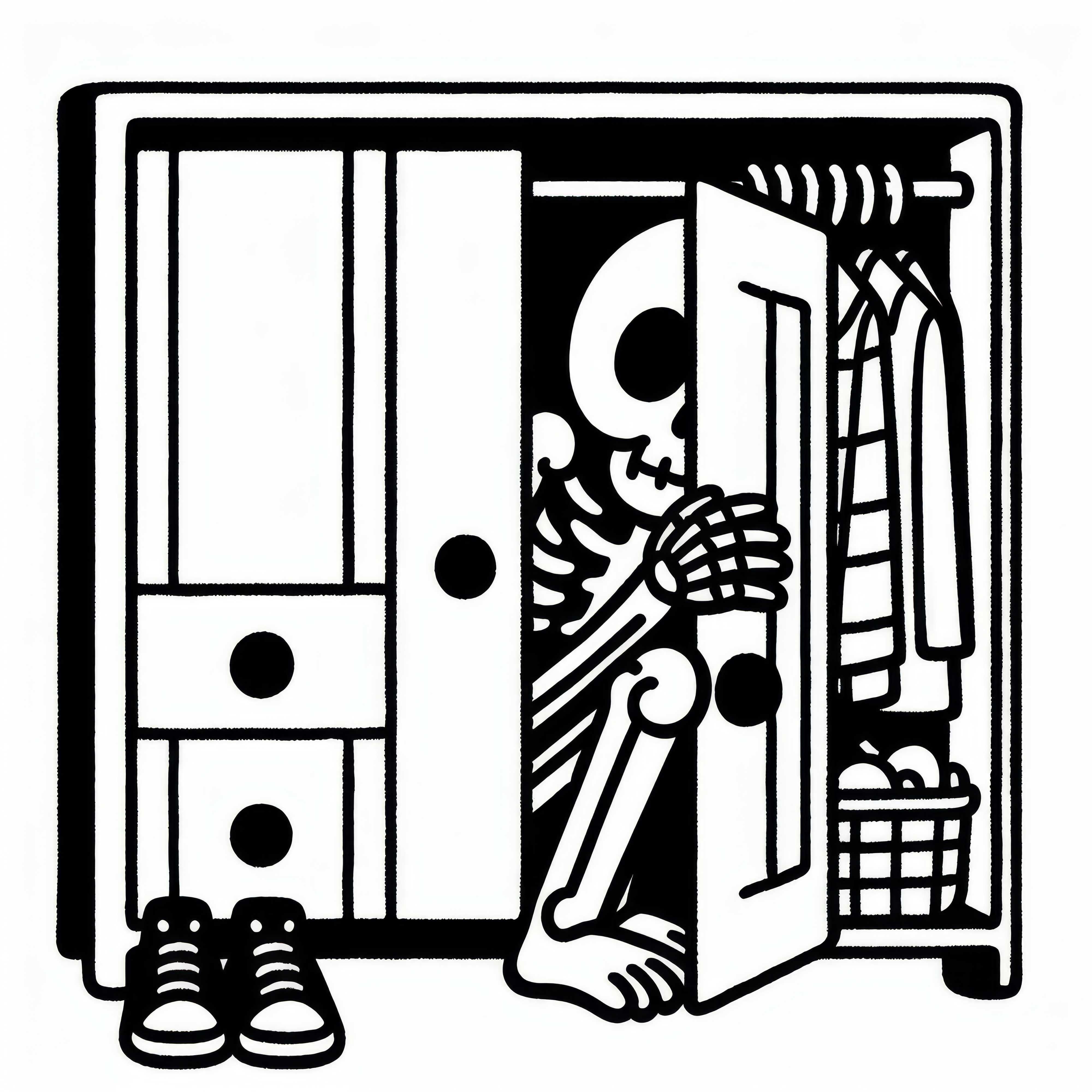 Skelett versteckt sich in Schrank vor Eindringlingen: Ausmalbild zum Herunterladen (Kostenlos)