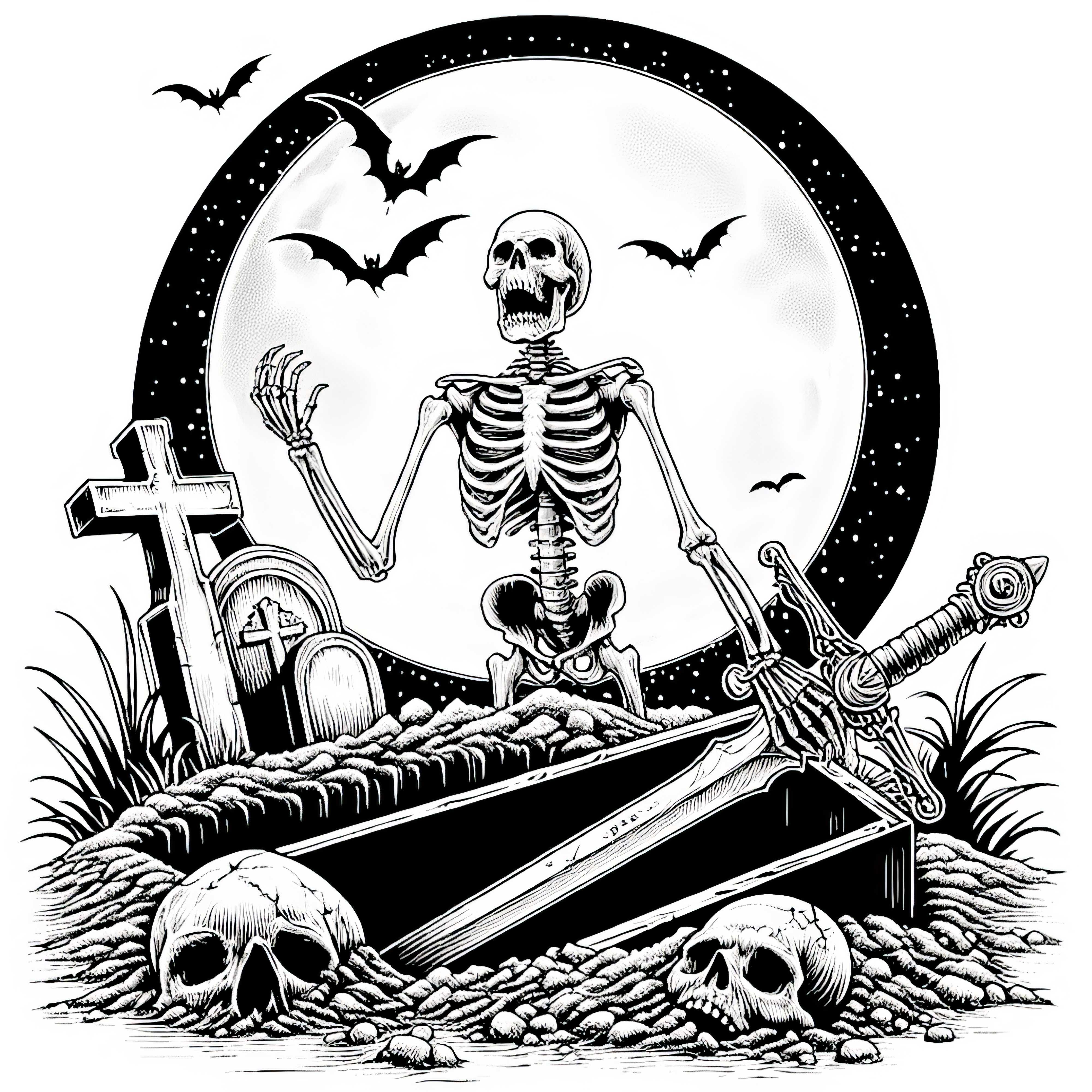 Skelett erhebt sich aus Grab mit Schwert: Gratis Malvorlage