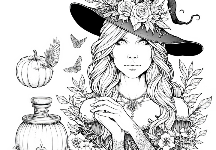 Hexe pflückt Kräuter in verwunschenem Garten: Ausmalbild zum Download (Kostenlos)