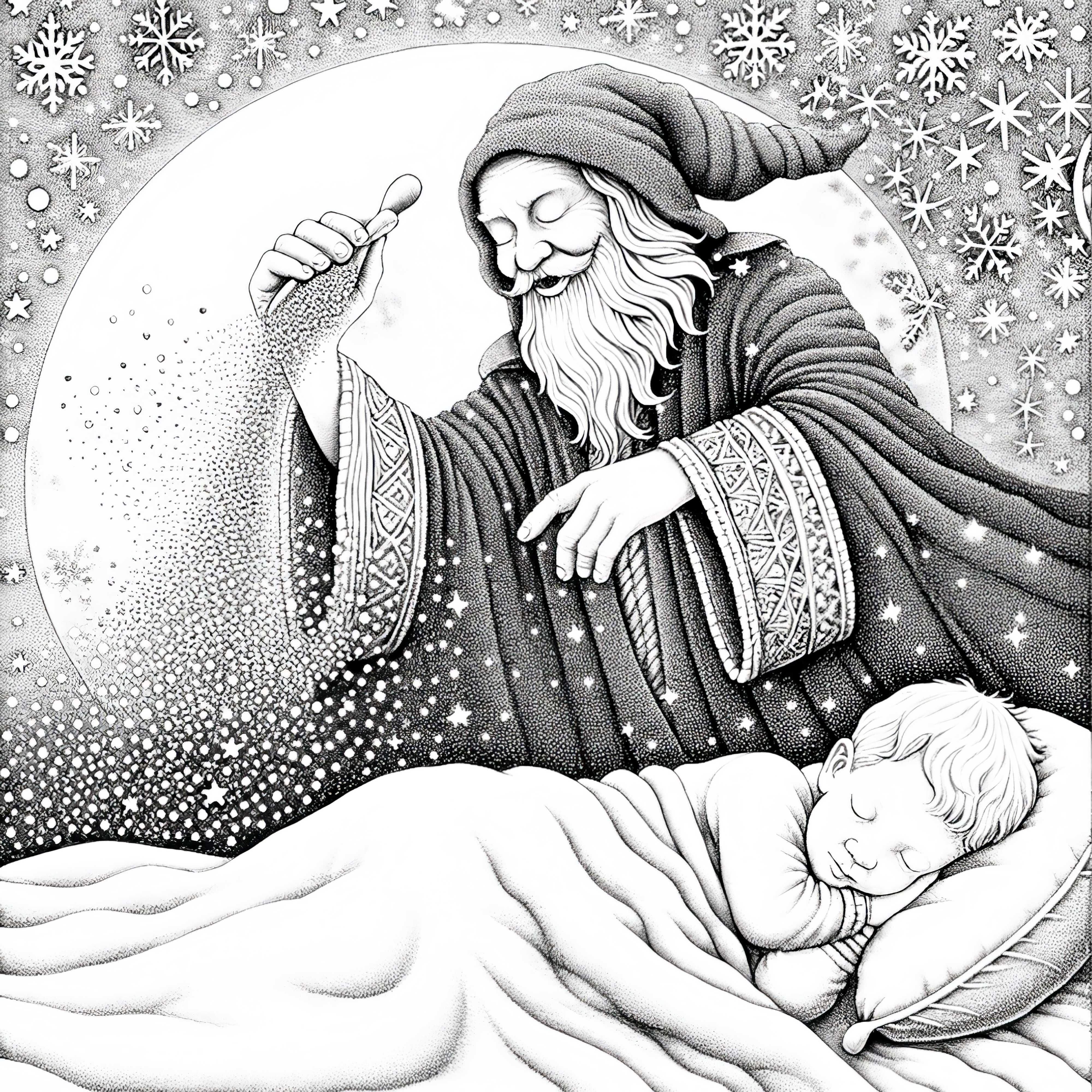 Sandmann lässt magische Traumsandwirbel durch Kinderzimmer schweben: Malvorlage zum Herunterladen (Kostenlos)