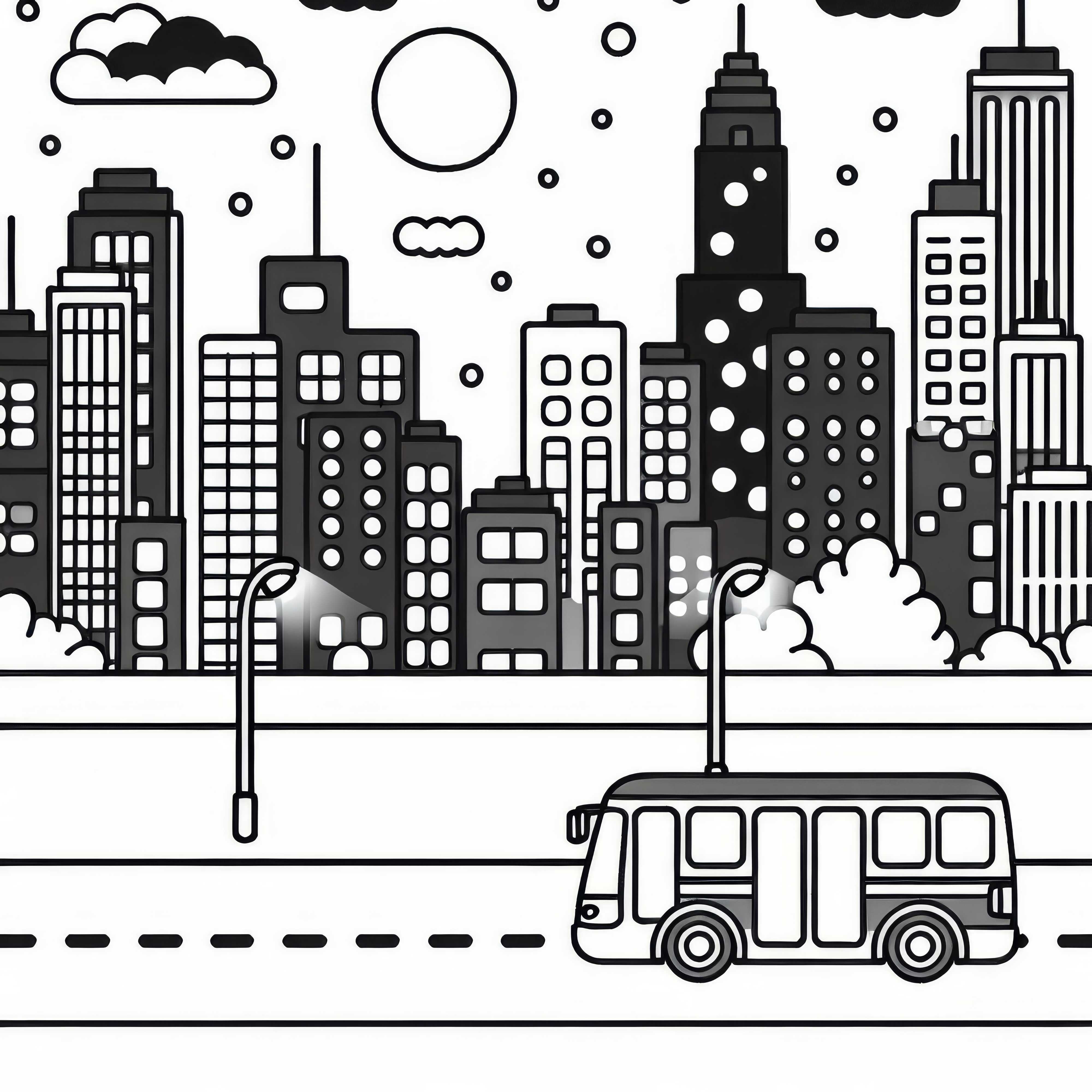 Doppeldeckerbus fährt durch große Stadt – Malvorlage kostenlos