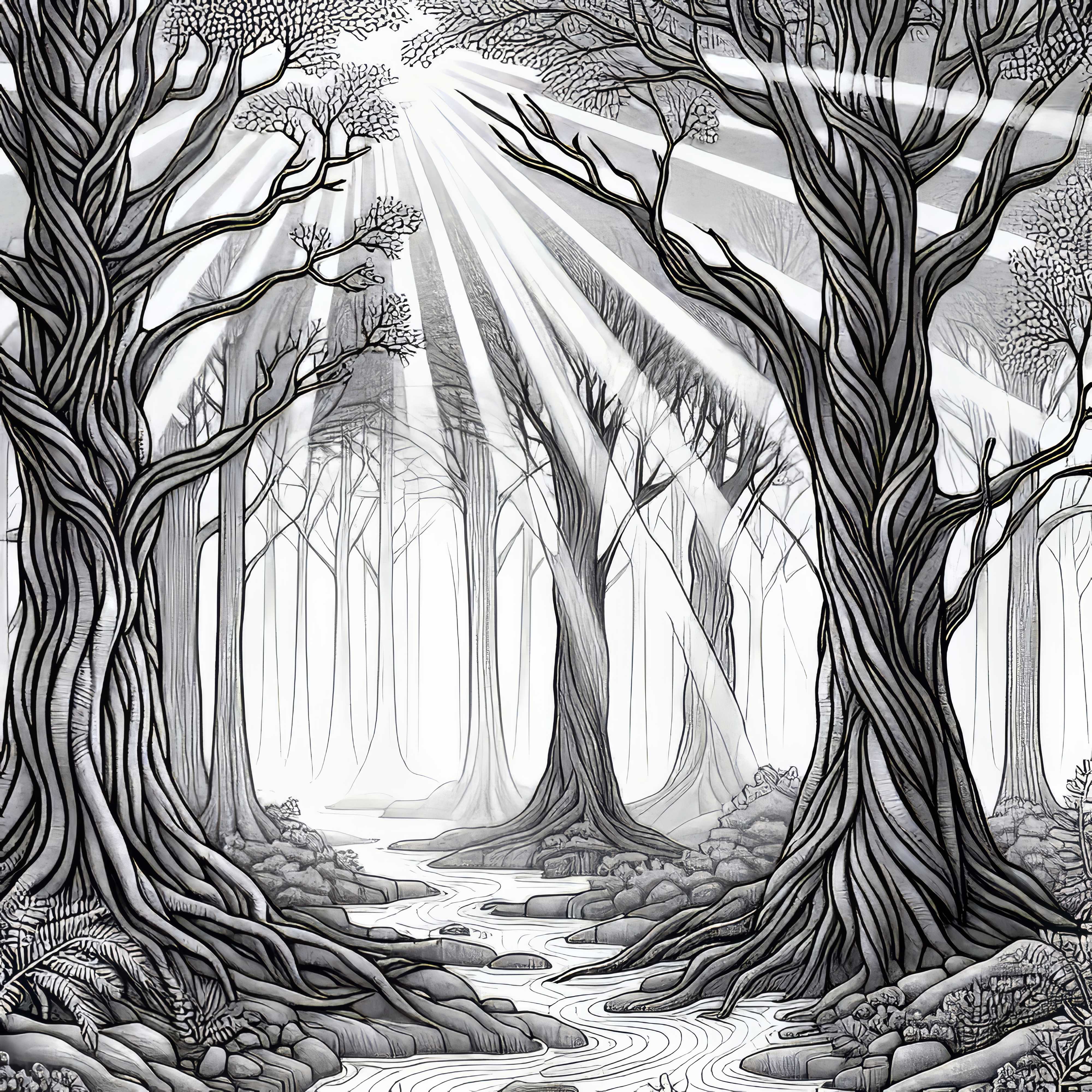 Sowohl der mystische Nebelwald als auch die Lichtstrahlen in der Malvorlage