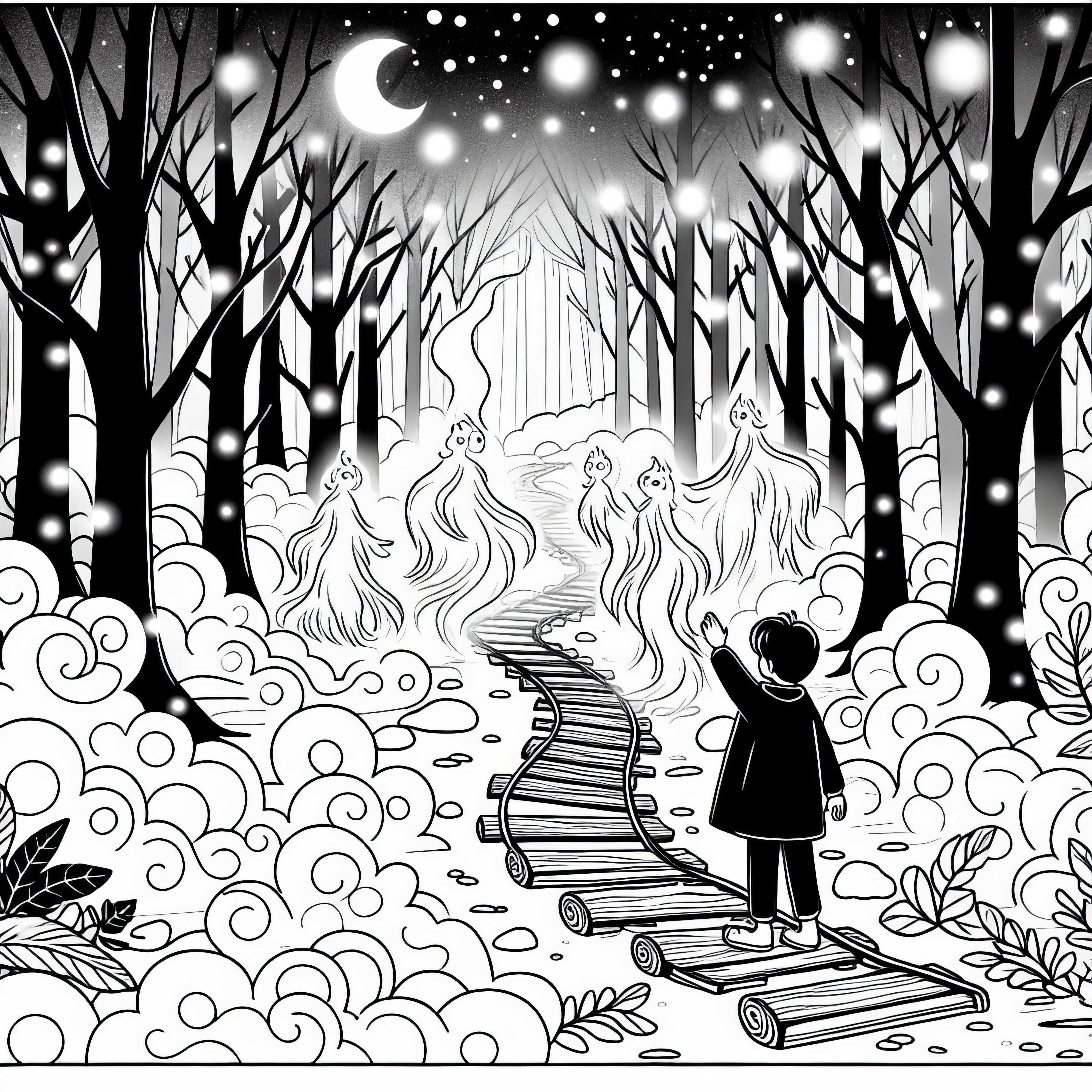 Das Bild zeigt ein Kind, das den charmanten Waldgeistern begegnet und die Möglichkeiten, das Motiv farbenfroh auszumalen, sind schier endlos. Du kannst sanfte Grüntöne für die Bäume verwenden, leuchtende Farben für die Geister und sanfte Blautöne für den Nebel. Die Entscheidung, mit welchen Farben du das Bild gestaltest, hängt ganz von deiner Fantasie ab.