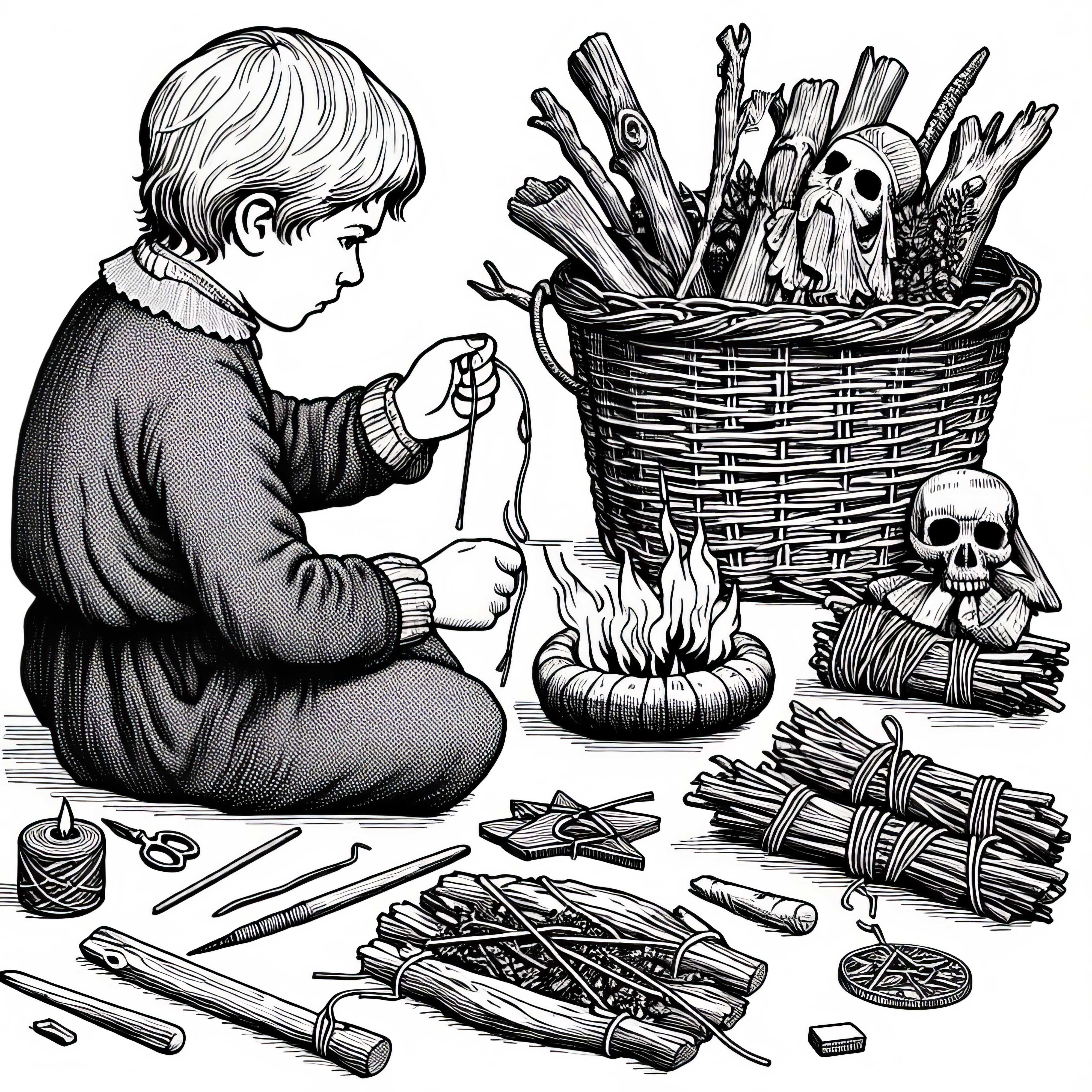 Kräuter auf Tisch sortieren: Malvorlage zur Hexenverfolgung kostenlos herunterladen