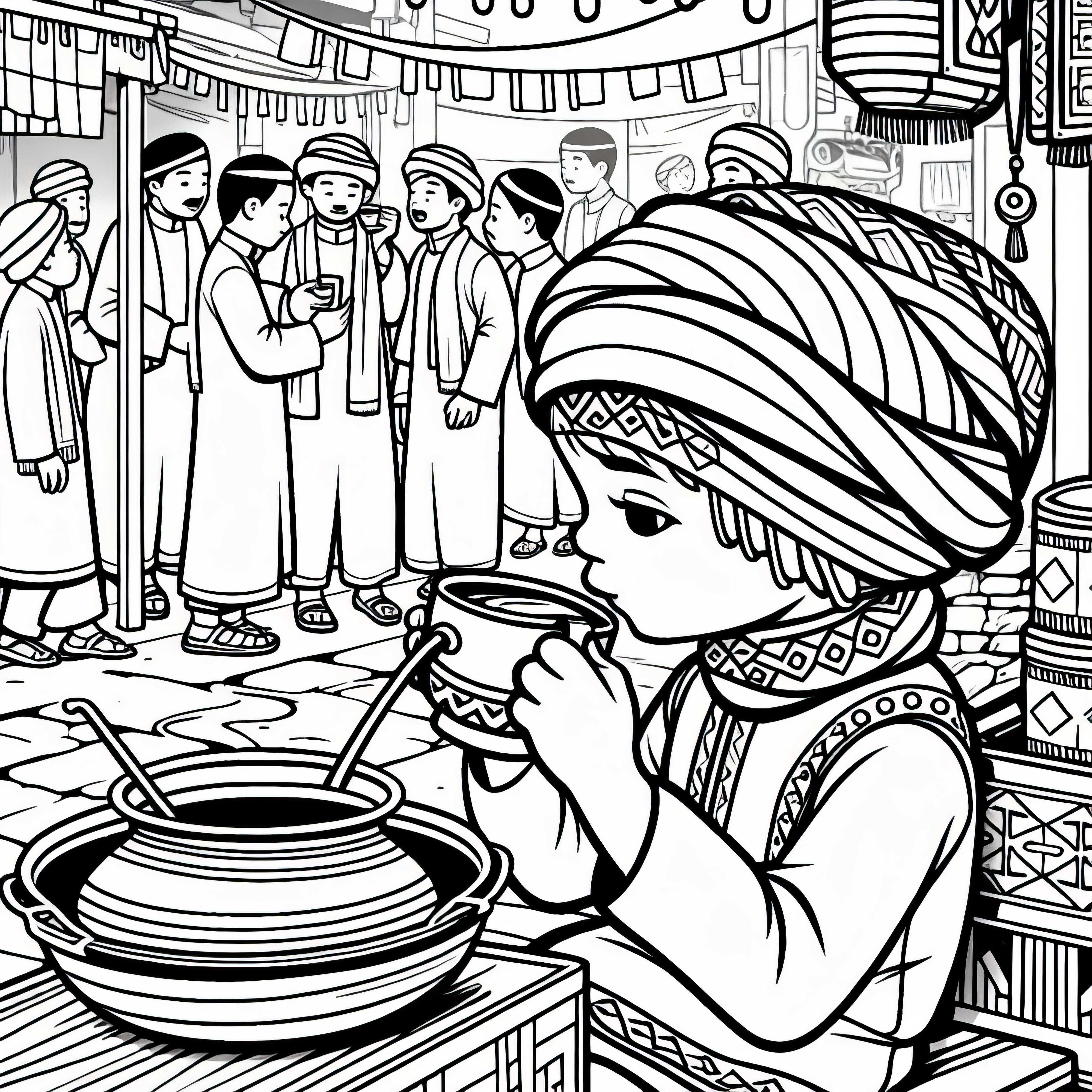 Tokio Manga Zeichner sitzt am Straßenrand, Kinder schauen neugierig zu – Ausmalbild gratis