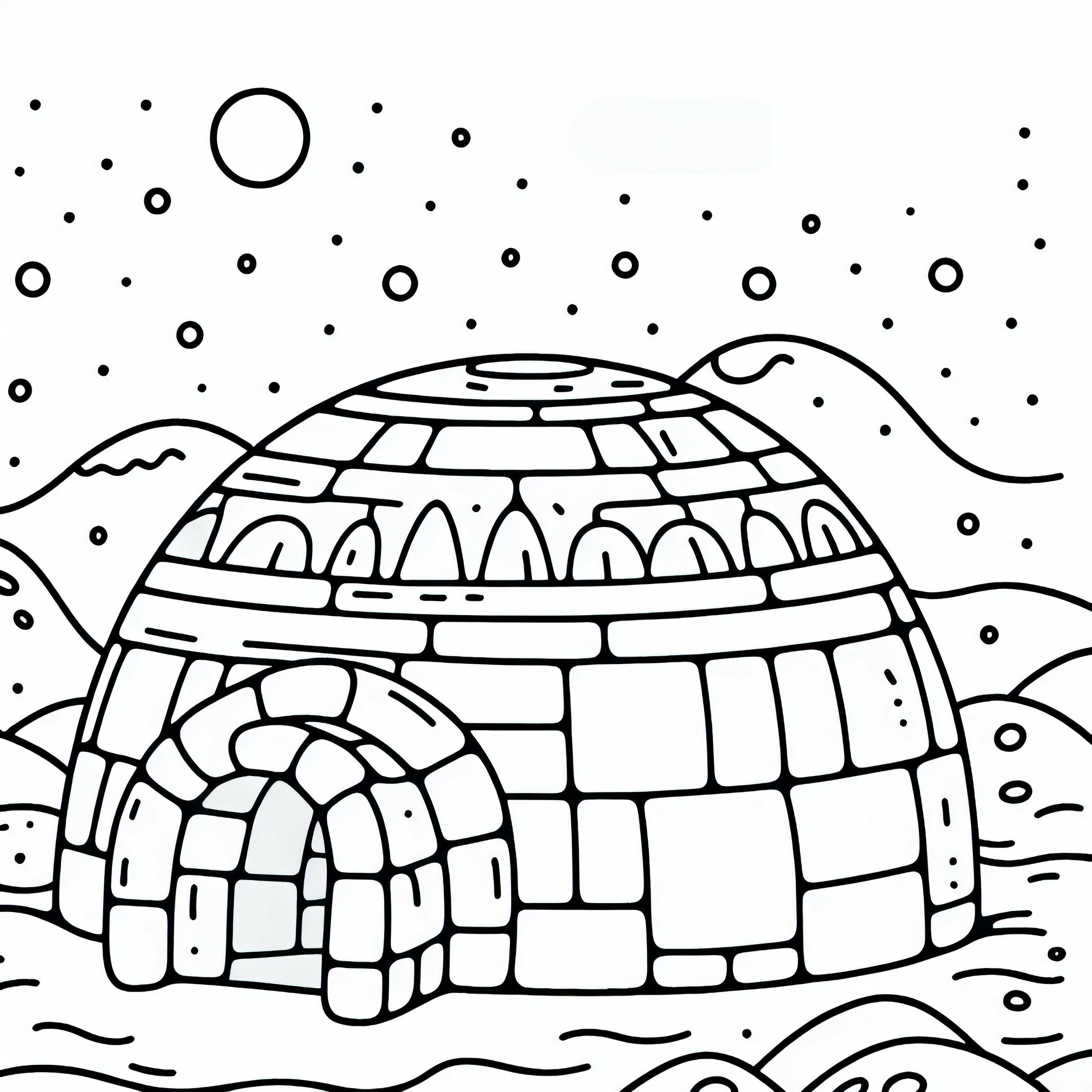 Ausmalbild eines Iglus in winterlicher Landschaft – lade dir das Bild jetzt herunter!
