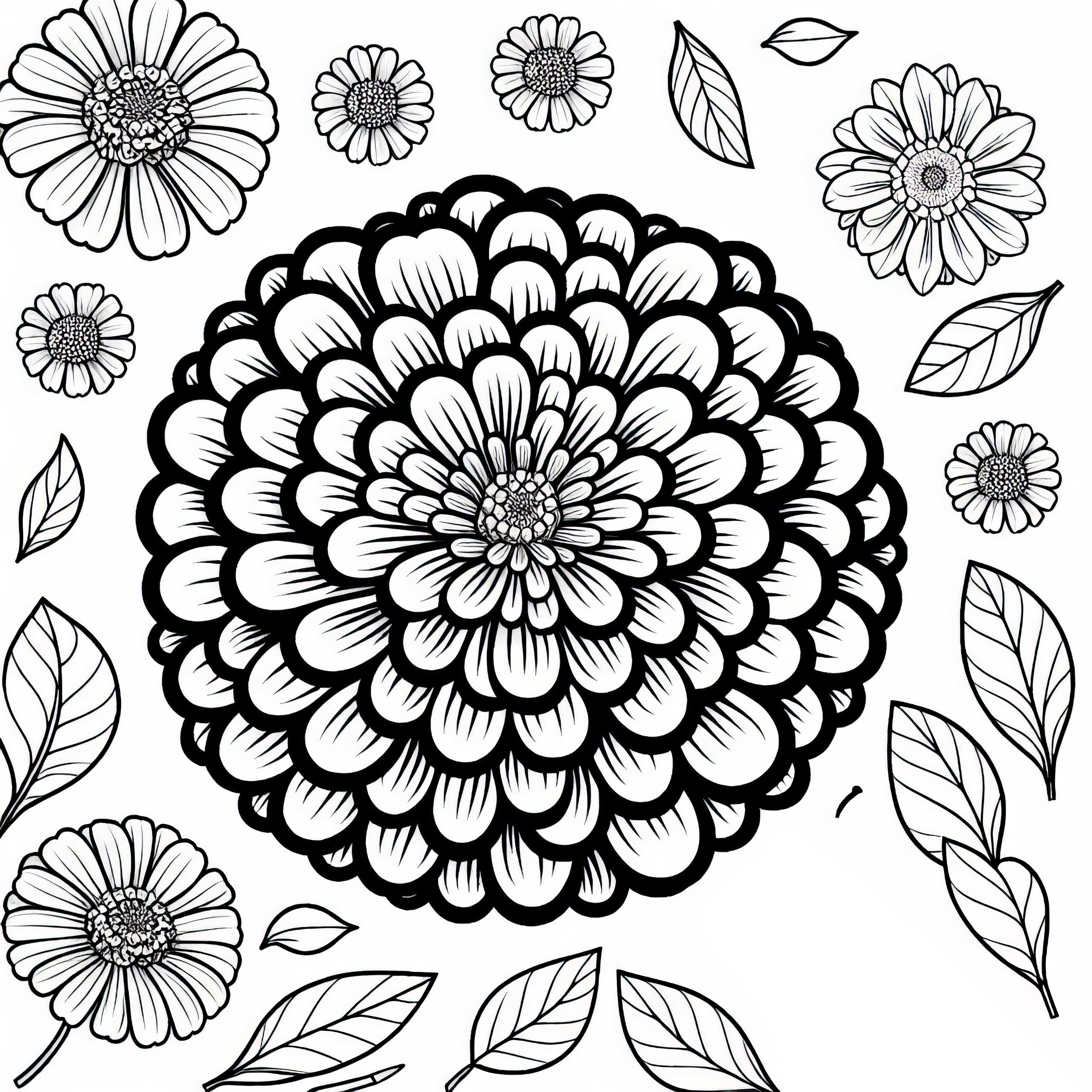 Das Ausmalbild zeigt eine prächtige Zinnie in voller Blüte