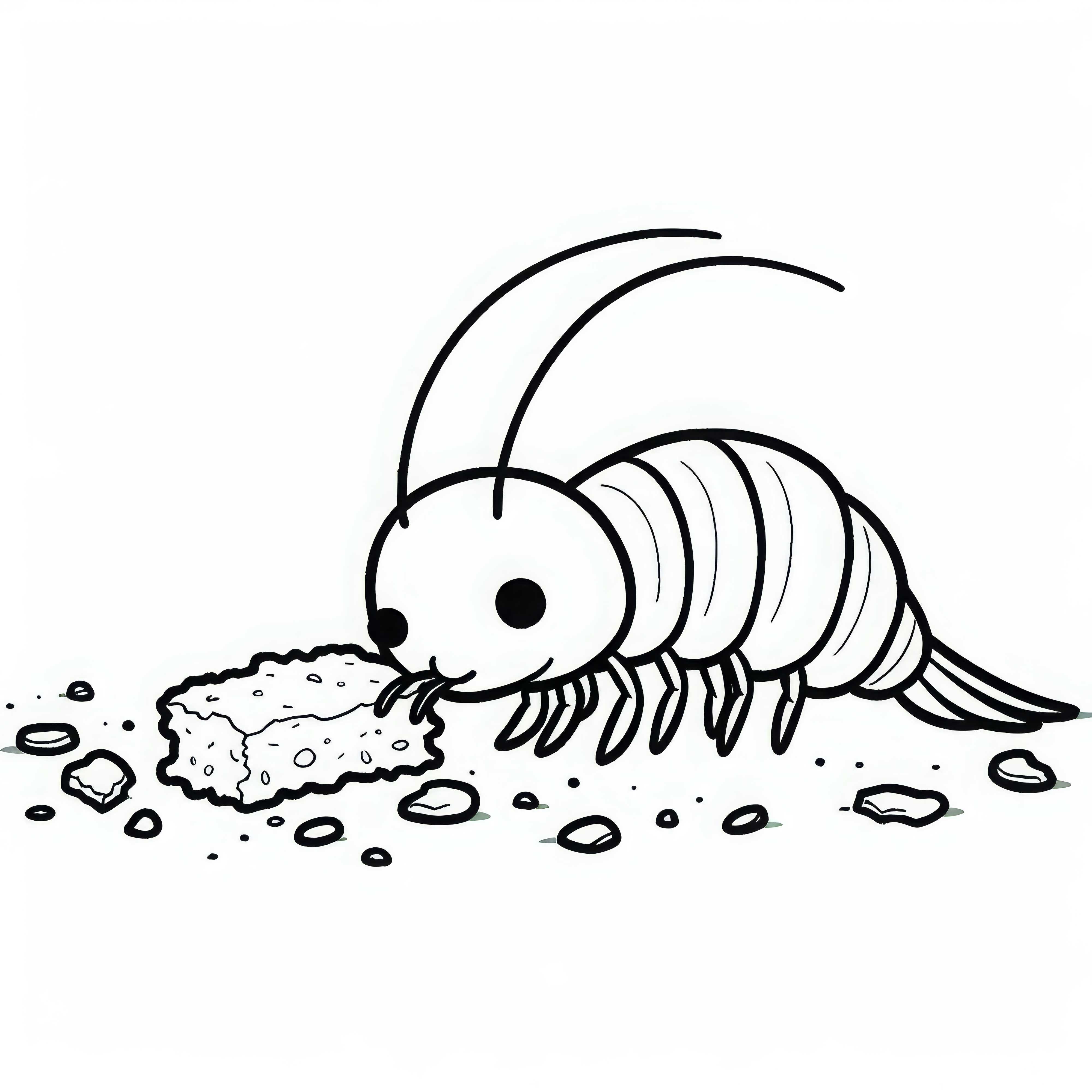 Ein Silberfisch frisst an einem Krümel auf dem Boden – Malvorlage einfach gratis