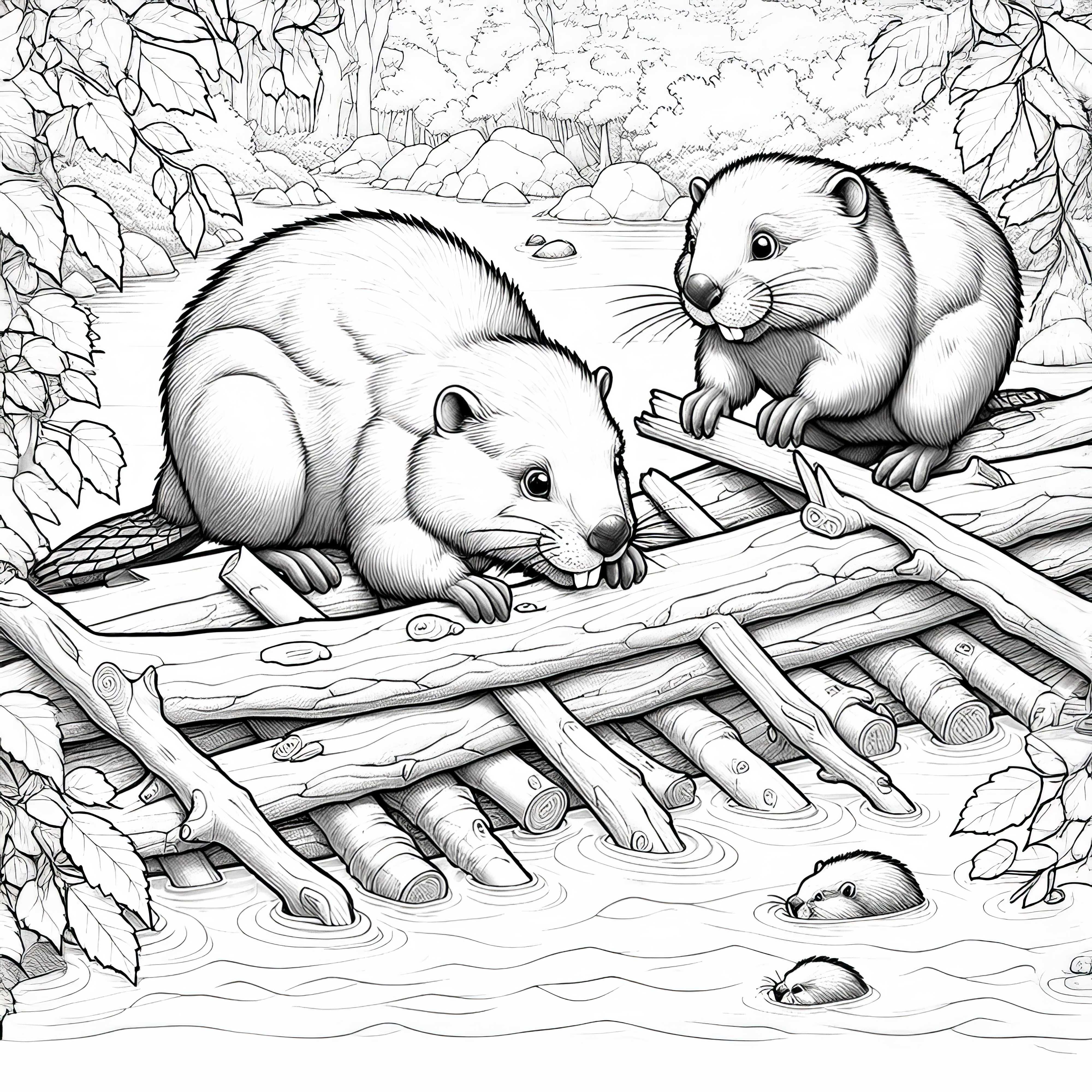 Zwei Biber bauen einen Staudamm: Einfache Malvorlage (Kostenlos)
