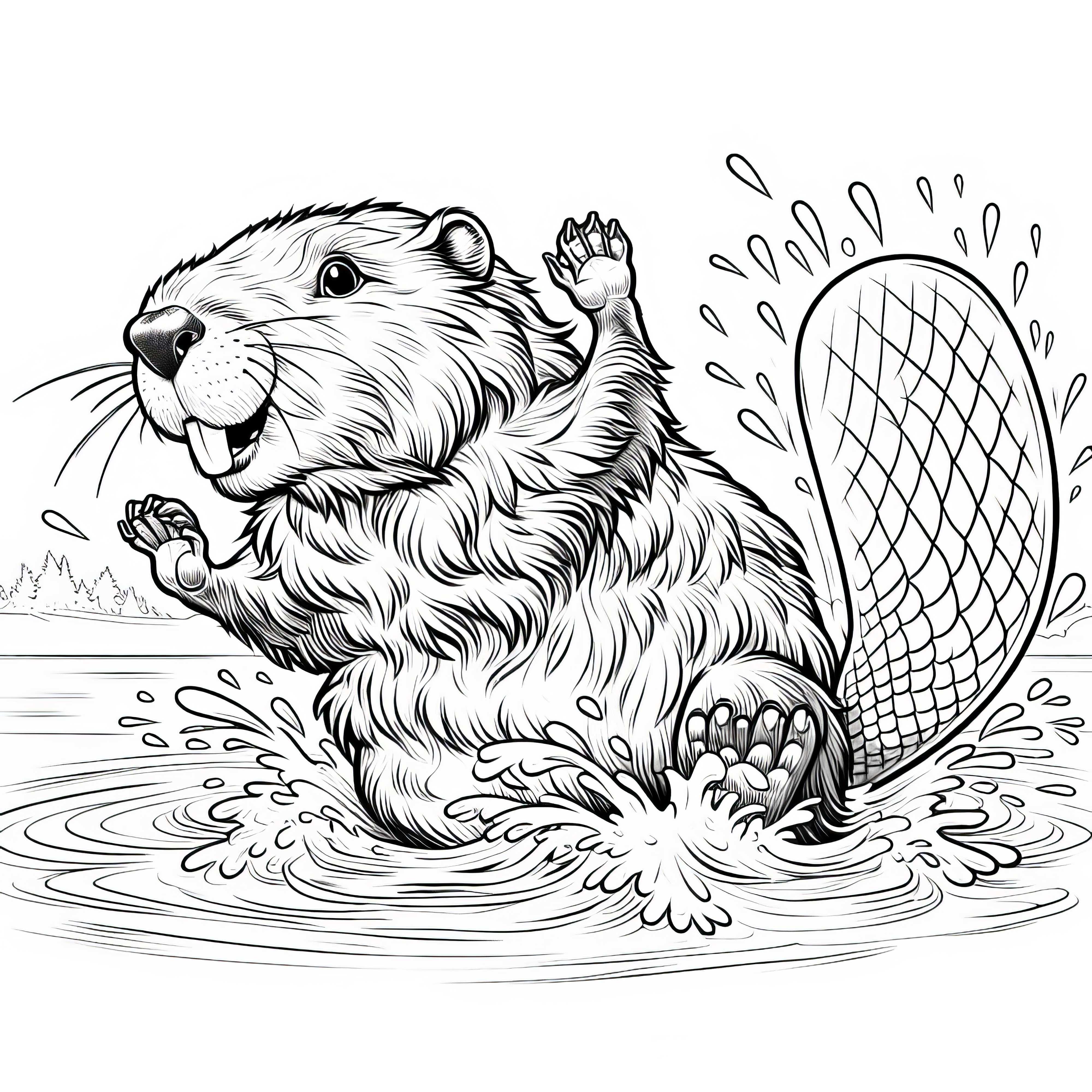 Biber schwimmt mit Ast im Maul durch Fluss: Einfaches Ausmalbild (Gratis)