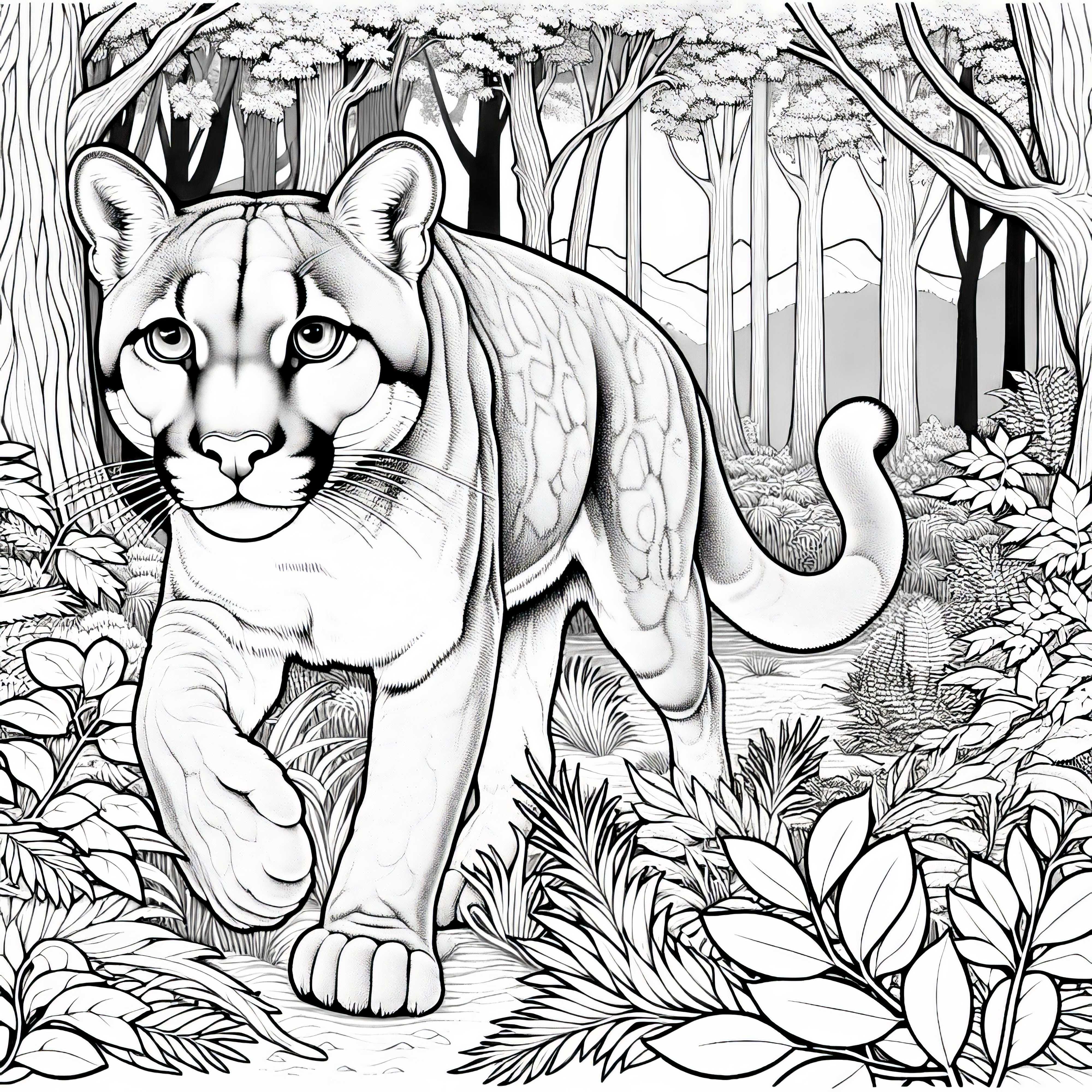 Puma schleicht lautlos durch dichten Wald – Malvorlage einfach gratis