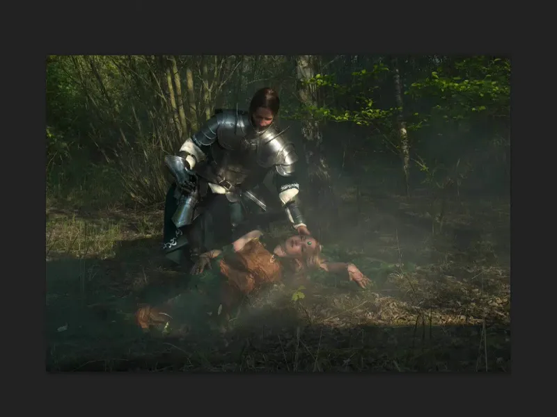 Der Lichteffekt, das sind ja hier im Originalbild echte Sonnenstrahlen, so wie es aus der Kamera kam. Wir hatten eine kleine Nebelmaschine im Einsatz und hatten Glück, dass genau durch die Blätter ein paar Strahlen auf den Nebel fielen. Wenn ich so was sehe, dann denke ich natürlich an Photoshop und, dass ich es noch ein bisschen verstärken muss.