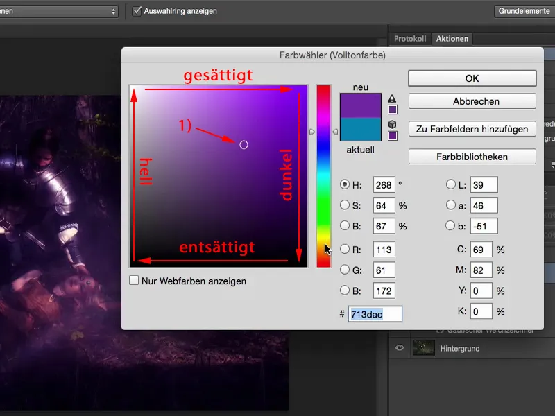 Du kannst hier auch die Helligkeit variieren. Also mit der Farbfläche kannst du dein Bild hell, dunkel, gesättigt, entsättigt machen, wie du gerade lustig bist. Das, finde ich, ist wirklich eine tolle Möglichkeit, weil Photoshop merkt sich immer diesen Punkt (1), an dem ich hier war.