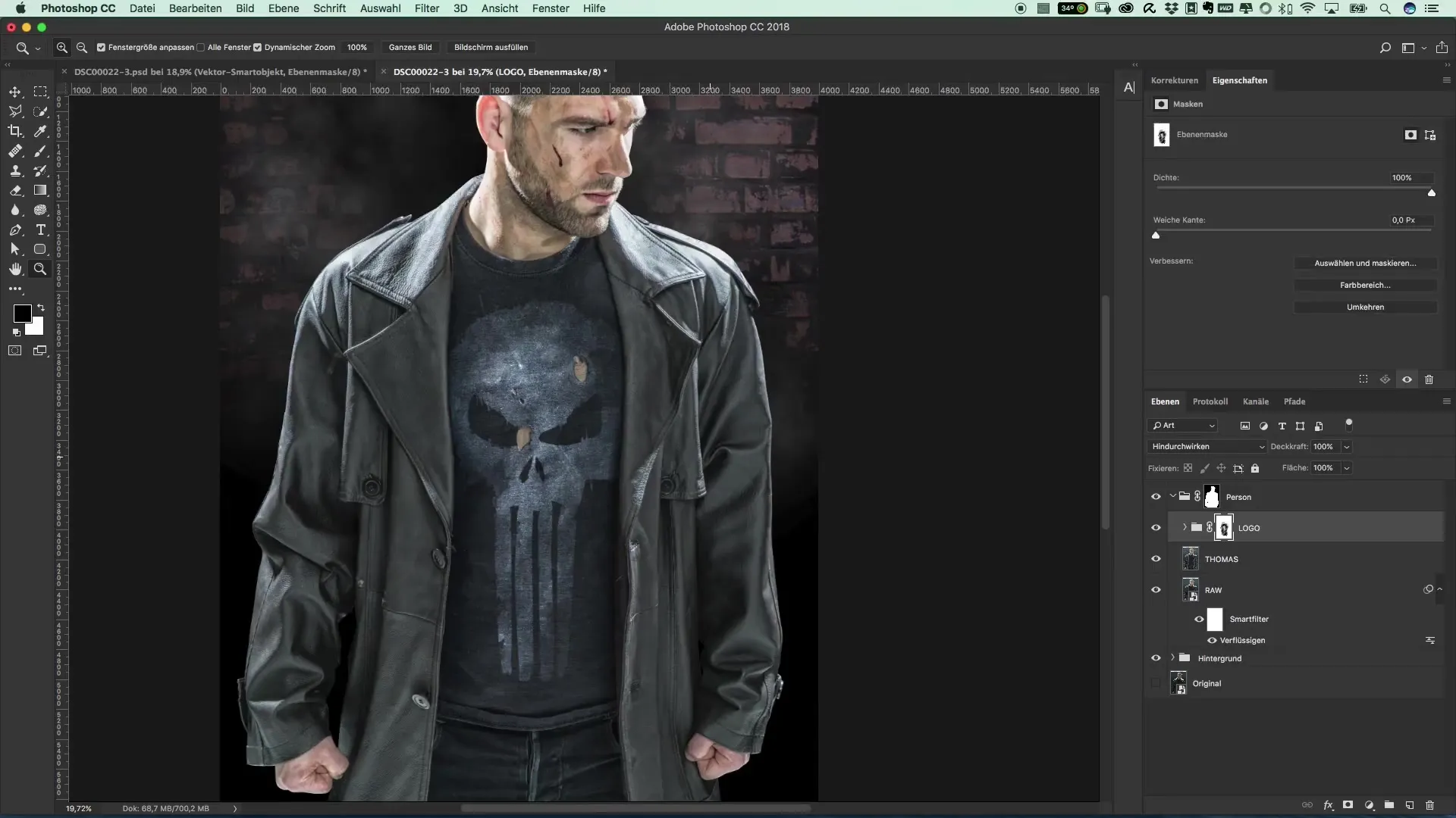 Nachdem du dein Design fertiggestellt hast, mach eine letzte Überprüfung. Blende die ursprüngliche Maske aus, um das fertige T-Shirt-Design zu sehen. Diese Vorgehensweise hält das Design organisch und gibt ihm den gewünschten Charakter.