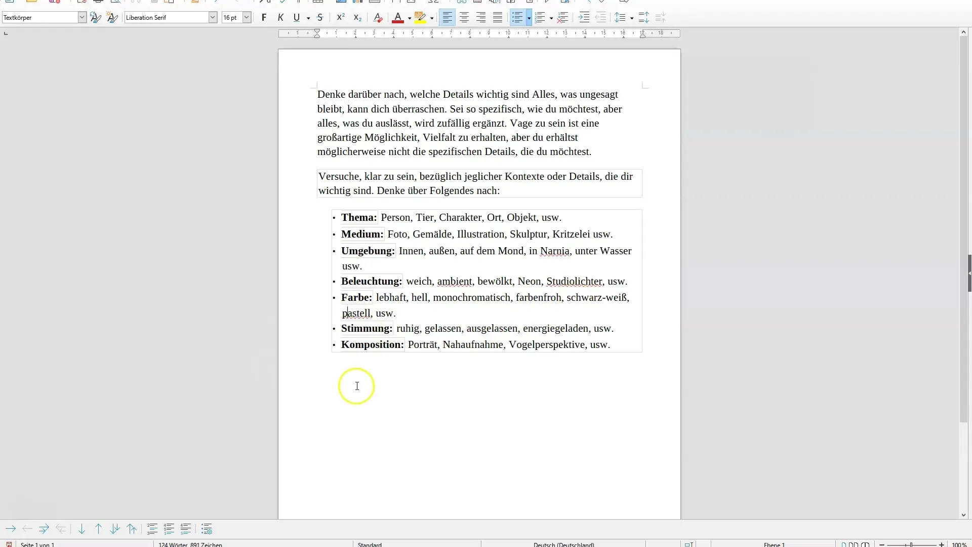 - Details wie Thema, Medium, Umgebung, Beleuchtung, Farben, Stimmung und Komposition spielen dabei eine wesentliche Rolle.